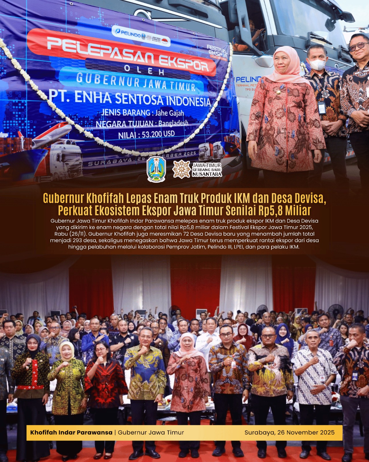 Harian Cakrawala – SURABAYA, 27 NOVEMBER 2025, Gubernur Jawa Timur Khofifah Indar Parawansa melepas enam truk produk ekspor Industri Kecil Menengah (IKM) Desa Devisa Jawa Timur dengan nilai total USD351,6 ribu atau setara Rp5,8 miliar. Pelepasan dilakukan dalam gelaran Festival Ekspor Jawa Timur 2025 yang berlangsung di PT Terminal Petikemas Surabaya (TPS), Rabu (26/11).