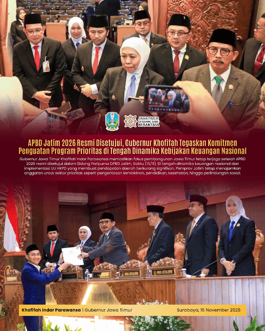 APBD Jatim 2026 Disetujui, Gubernur Khofifah Tegaskan Komitmen Jalankan Program Prioritas di Tengah Dinamika Fiskal Nasional