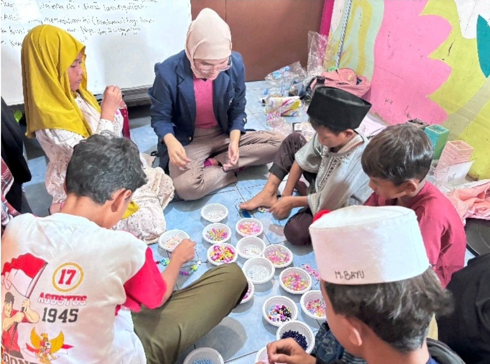 Metode pembelajaran yang digunakan dalam kegiatan ini mengacu pada pendekatan ACTORS. Pada sesi ini, nilai Opportunity menjadi fokus utama, di mana anak-anak diajak untuk mengenal potensi diri dan belajar menciptakan nilai tambah (value creation) dari karya yang mereka hasilkan. Selama kegiatan berlangsung, suasana tampak hangat dan antusias. Anak-anak berdiskusi tentang warna, desain, hingga pola roncean yang mereka sukai. Setiap hasil karya kemudian dipamerkan di meja kecil yang telah disiapkan oleh tim mahasiswa. “Aku ingin menjual phone strap ini di sekolah nanti,” ujar salah satu anak dengan penuh semangat.