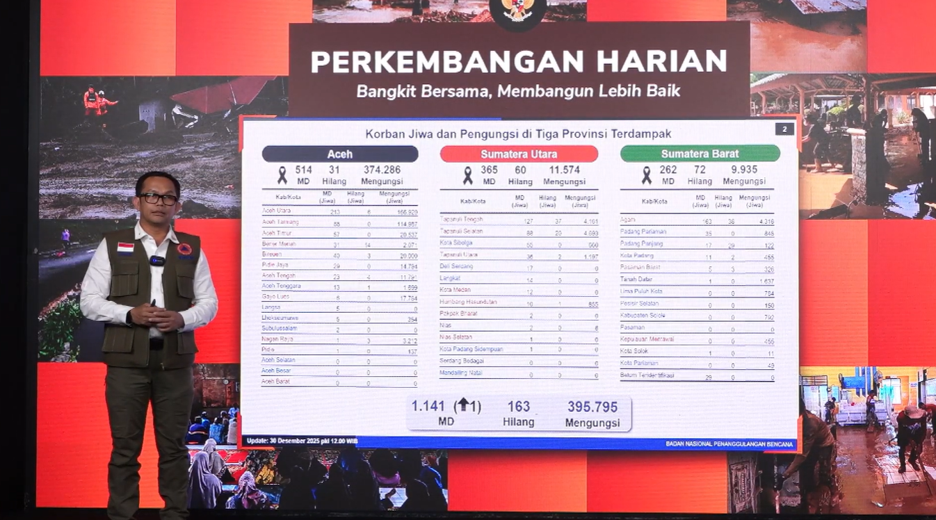 “Per hari ini bertambah satu orang meninggal dunia, sehingga total korban jiwa menjadi 1.141 orang. Kami terus menyampaikan doa dan simpati yang mendalam kepada keluarga korban,” ujar Abdul Muhari dalam Konferensi Pers Update Penanganan Bencana Banjir dan Longsor, Selasa (30/12/2025).