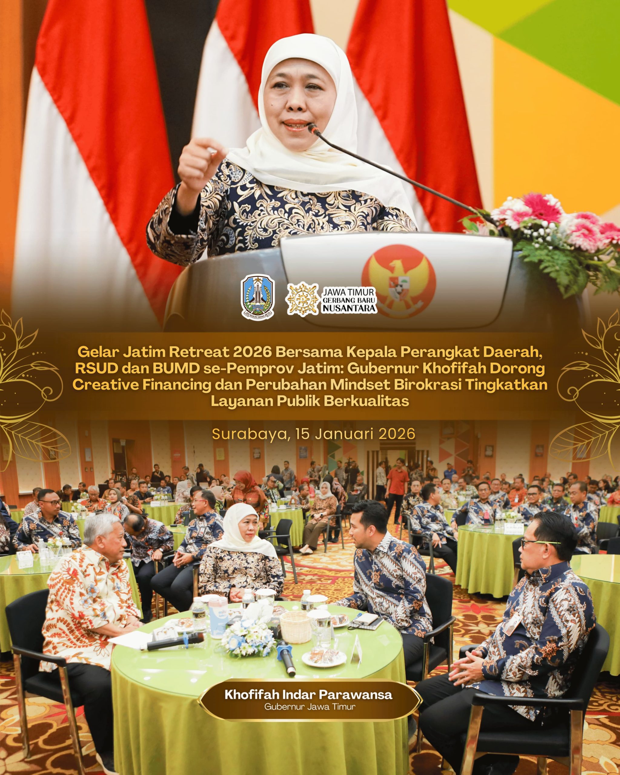 Dalam kesempatan tersebut, Gubernur Khofifah menyampaikan apresiasi kepada seluruh pihak yang menggagas pelaksanaan Jatim Retreat 2026 yang diikuti oleh 135 peserta dari unsur birokrasi, BUMD, RSUD, hingga penyelenggara layanan publik di Jawa Timur.