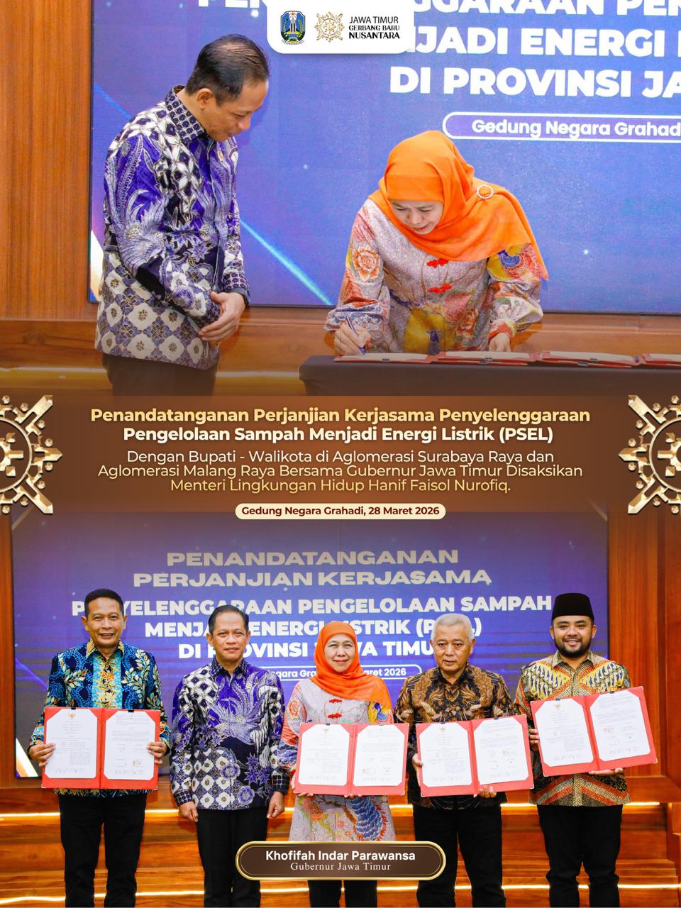 Harian Cakrawala – SURABAYA, 29 MARET 2026, Gubernur Jawa Timur Khofifah Indar Parawansa menandatangani Perjanjian Kerja Sama (PKS) Pengolahan Sampah menjadi Energi Listrik (PSEL) bersama tujuh Bupati dan Wali Kota di kawasan Surabaya Raya dan Malang Raya di Gedung Negara Grahadi Surabaya, Sabtu (28/3) malam.