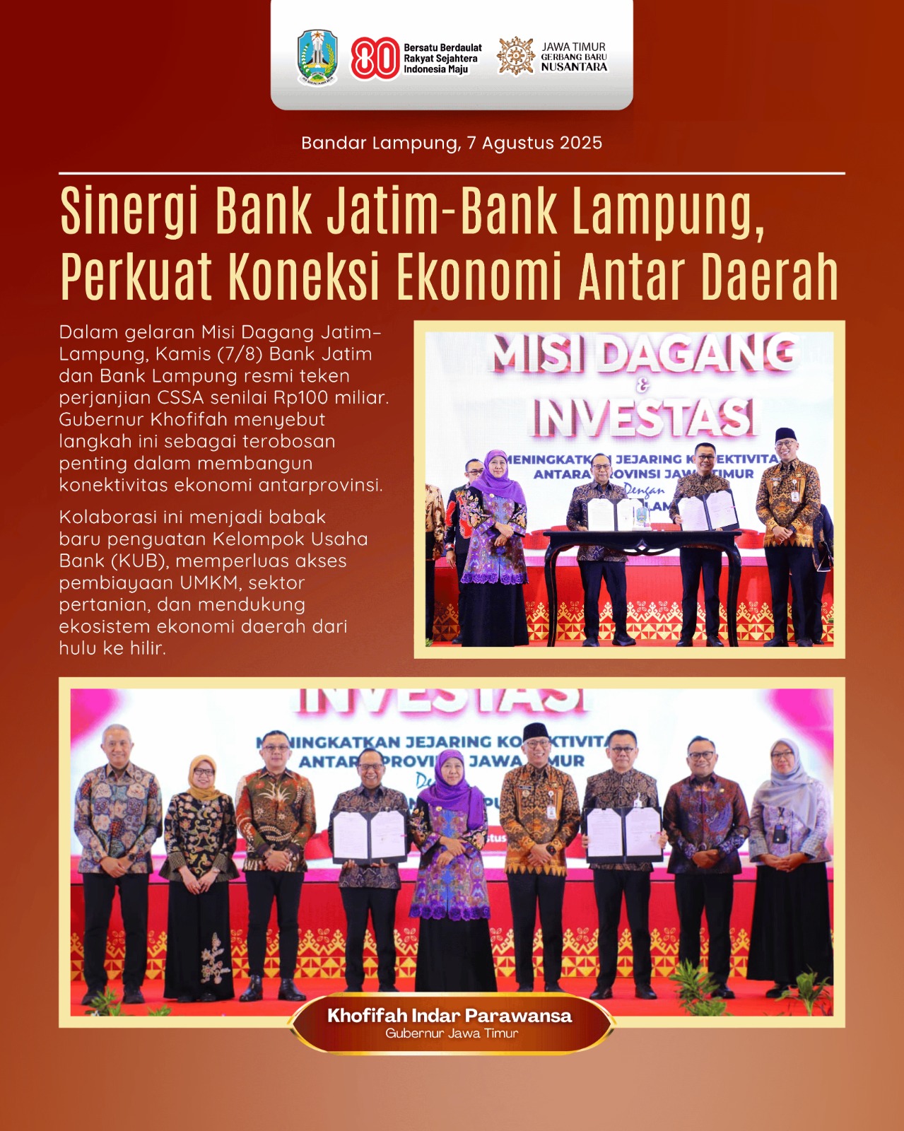 “Kami juga sangat mendukung kerja sama perbankan antara Bank Jatim dan Bank Lampung. Kolaborasi ini akan memperkuat sistem keuangan daerah dan menjadi energi baru bagi penguatan UMKM di Lampung,” pungkasnya.