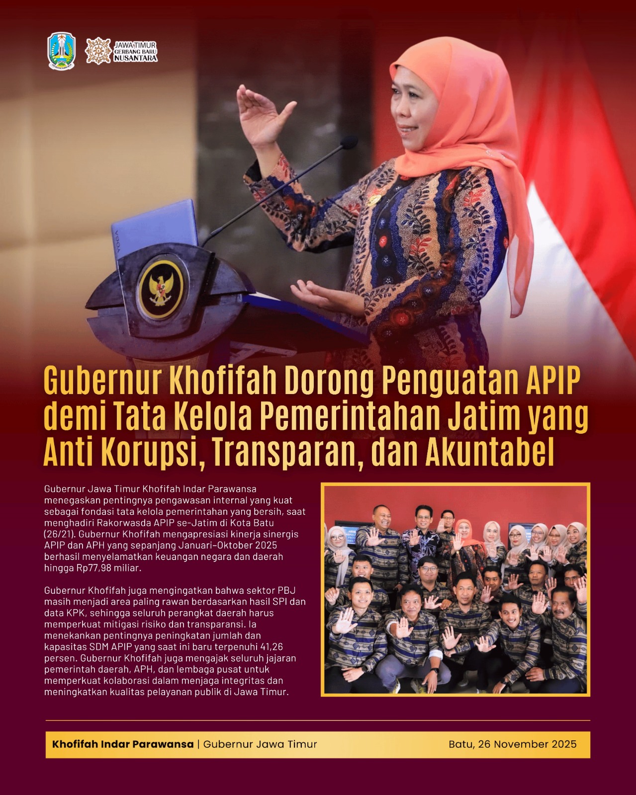 Harian Cakrawala – BATU, 27 NOVEMBER 2025, Gubernur Jawa Timur Khofifah Indar Parawansa terus mendorong Aparat Pengawas Internal (APIP) atau Inspektorat Daerah di Jawa Timur untuk meningkatkan efektivitas pengawasan sehingga tata kelola pemerintah lebih transparan dan akuntabel.
