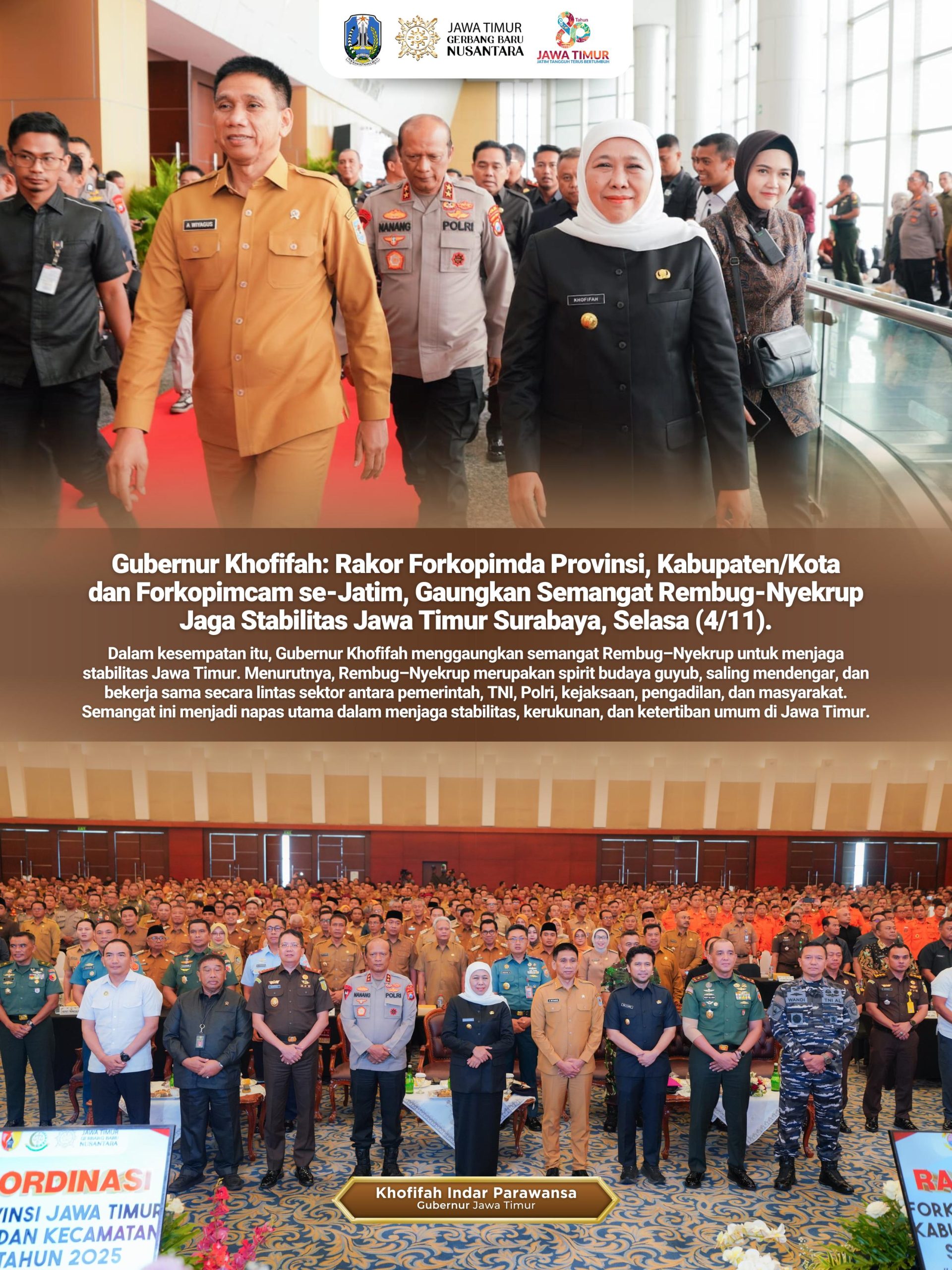 Dalam kesempatan itu, Gubernur Khofifah menggaungkan semangat Rembug–Nyekrup untuk menjaga stabilitas Jawa Timur. Menurutnya, Rembug–Nyekrup merupakan spirit budaya guyub, saling mendengar, dan bekerja sama secara lintas sektor antara pemerintah, TNI, Polri, kejaksaan, pengadilan, dan masyarakat. Semangat ini menjadi napas utama dalam menjaga stabilitas, kerukunan, dan ketertiban umum di Jawa Timur.