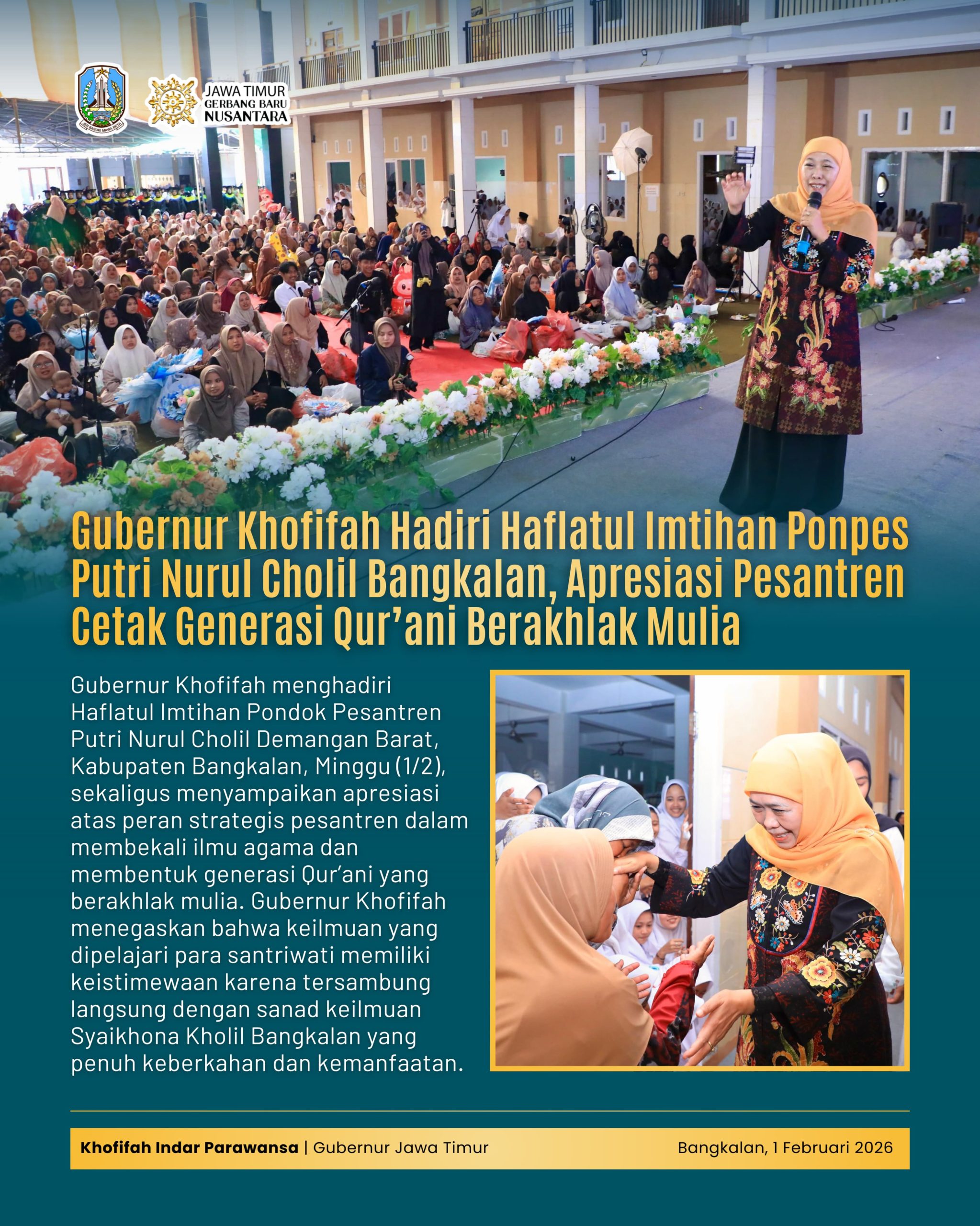 Harian Cakrawala – BANGKALAN, 1 FEBRUARI 2026, Gubernur Jawa Timur Khofifah Indar Parawansa mengapresiasi peran strategis pondok pesantren dalam membekali ilmu agama sekaligus membentuk generasi Qur’ani yang berakhlak mulia.