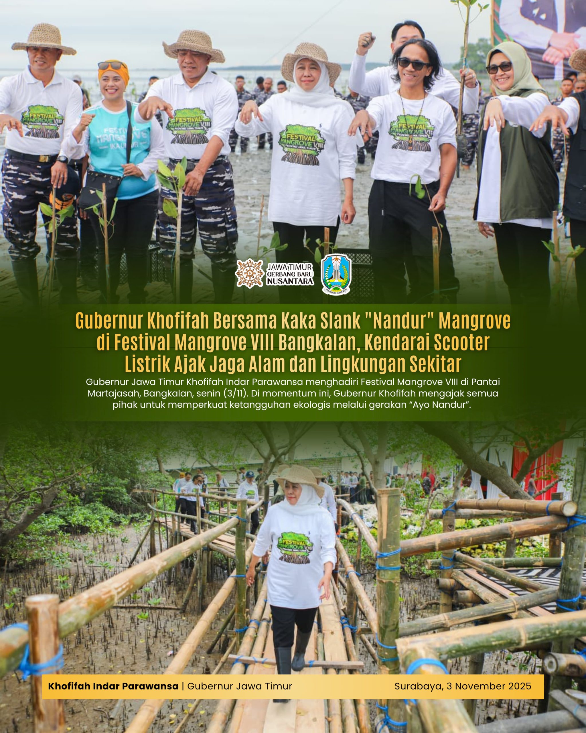 “Melalui program Mangrove Lestari, kita berkomitmen memperkuat ketahanan lingkungan dan berkontribusi nyata terhadap target Net Zero Emission 2060. Ini adalah ikhtiar Jawa Timur untuk menjaga bumi agar tetap lestari bagi generasi mendatang,” tegas Khofifah.