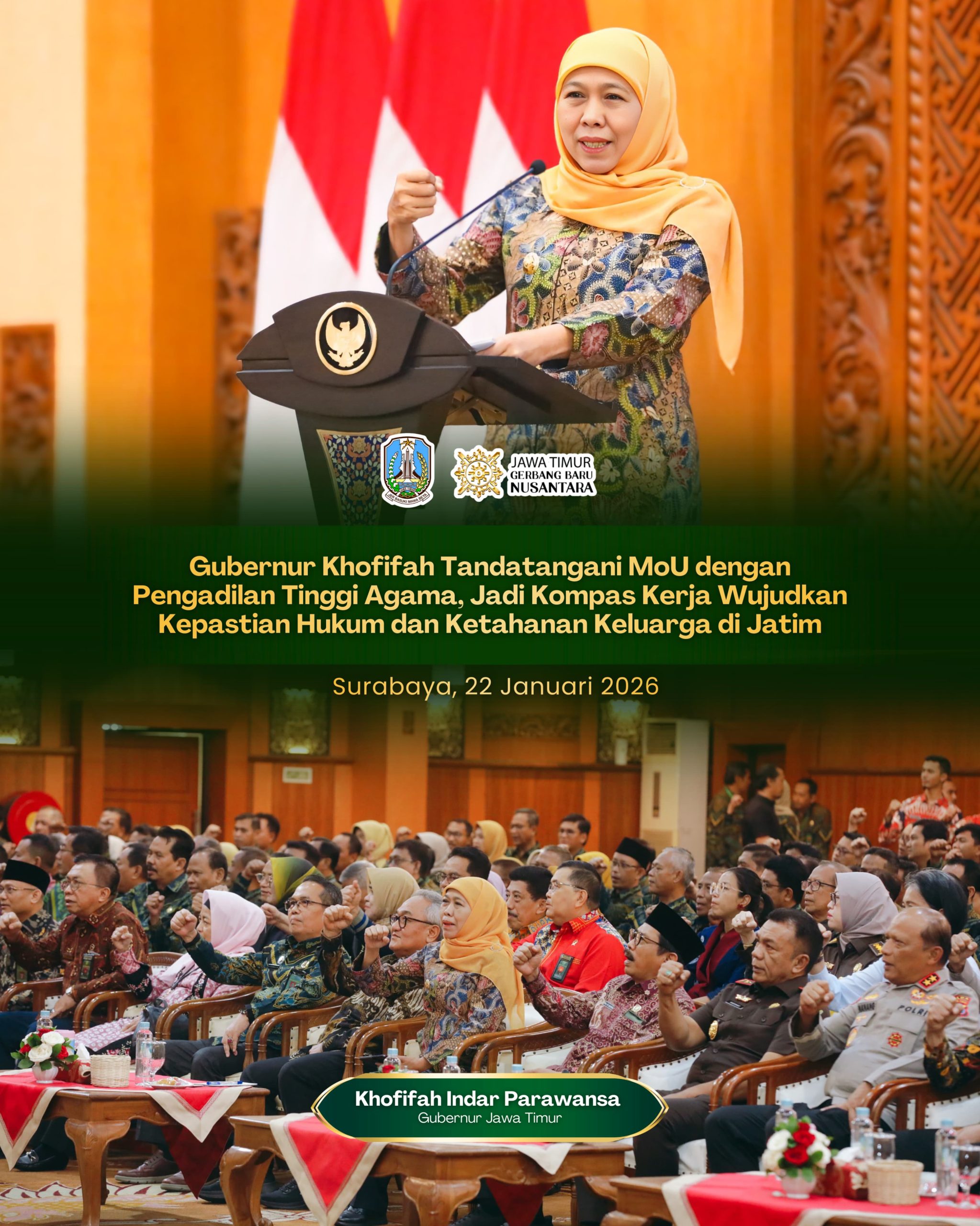 Harian Cakrawala – SURABAYA, 22 JANUARI 2026, Gubernur Jawa Timur Khofifah Indar Parawansa menandatangani Nota Kesepakatan (MoU) dengan Pengadilan Tinggi Agama Surabaya sebagai upaya mewujudkan kepastian hukum untuk menjaga ketahanan keluarga masyarakat di Provinsi Jatim. Penandatanganan MoU dilaksanakan di Ruang Hayam Wuruk Kantor Sekretariat Daerah Provinsi Jatim, Surabaya, Kamis (22/1).