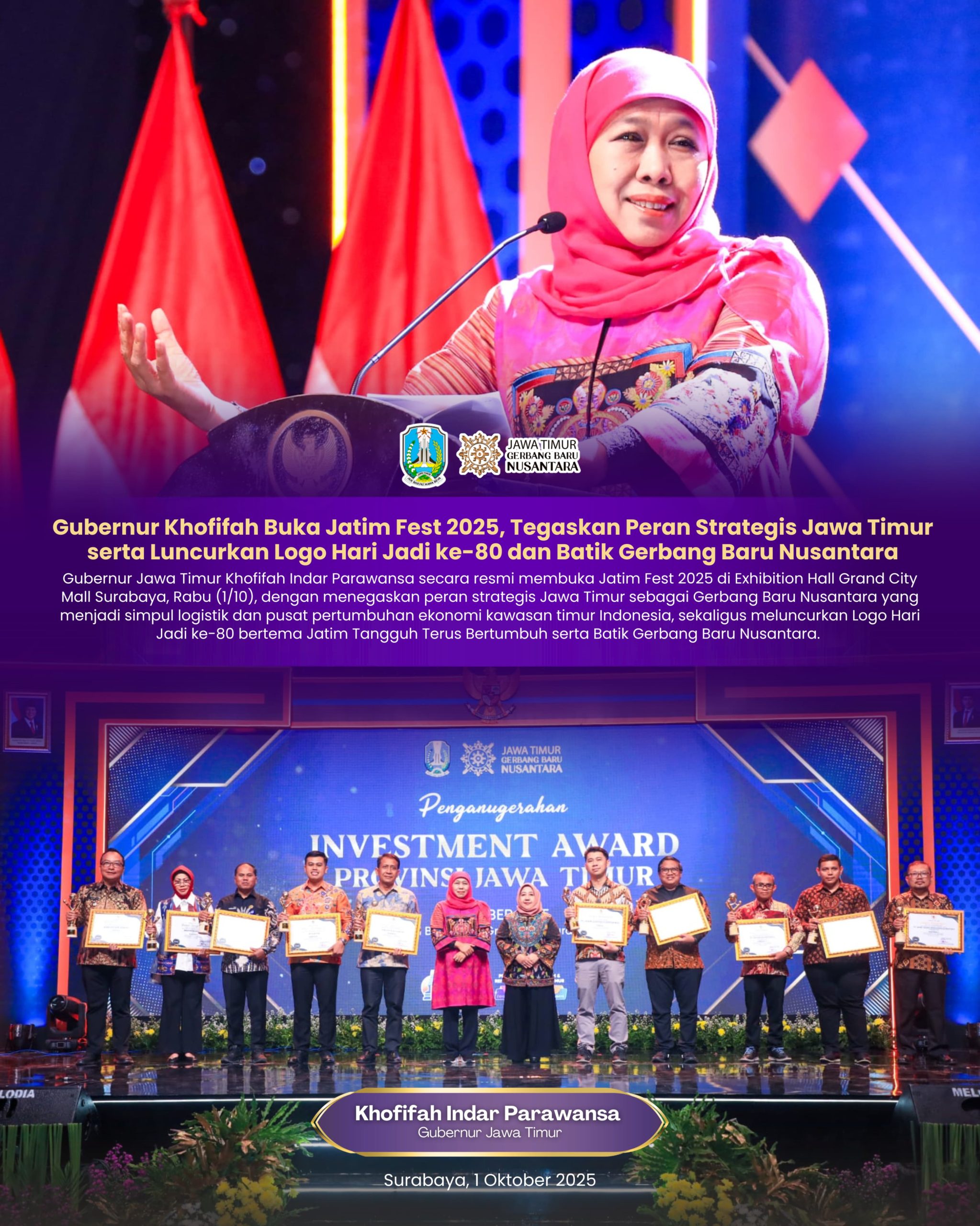Sejalan dengan capaian strategis tersebut, Gubernur Khofifah meluncurkan Logo Hari Jadi ke-80 dan Batik Gerbang Baru Nusantara. Kedua simbol ini bukan sekadar elemen visual, tetapi representasi semangat Jawa Timur dalam menjaga budaya, mendorong inovasi, dan memperkuat daya saing daerah.