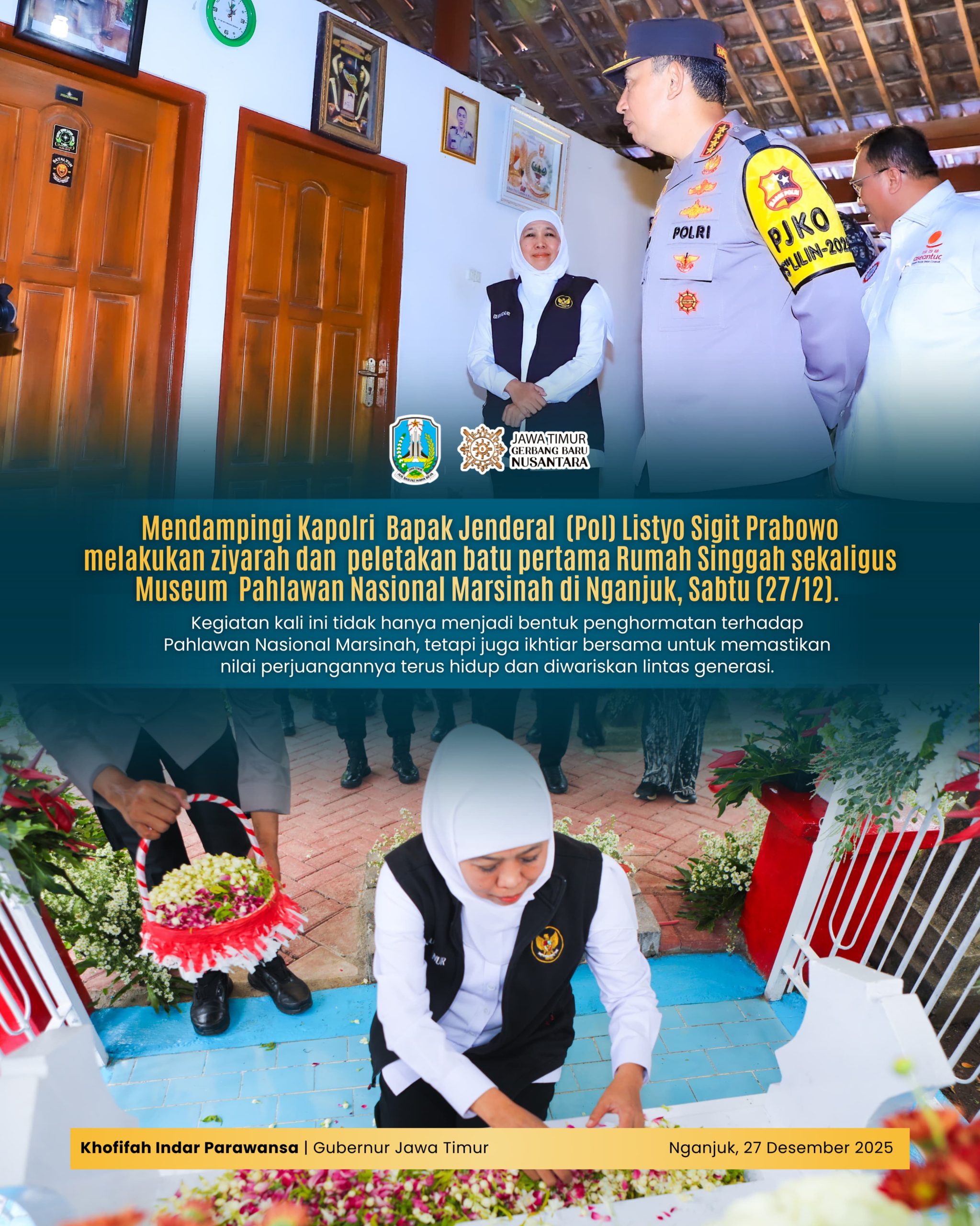 Harian Cakrawala – NGANJUK, 28 DESEMBER 2025, Gubernur Jawa Timur Khofifah Indar Parawansa mendampingi Kapolri Bapak Jenderal Listyo Sigit Prabowo melakukan ziyarah dan peletakan batu pertama Rumah Singgah sekaligus Museum Pahlawan Nasional Marsinah di Nganjuk, Sabtu (27/12).