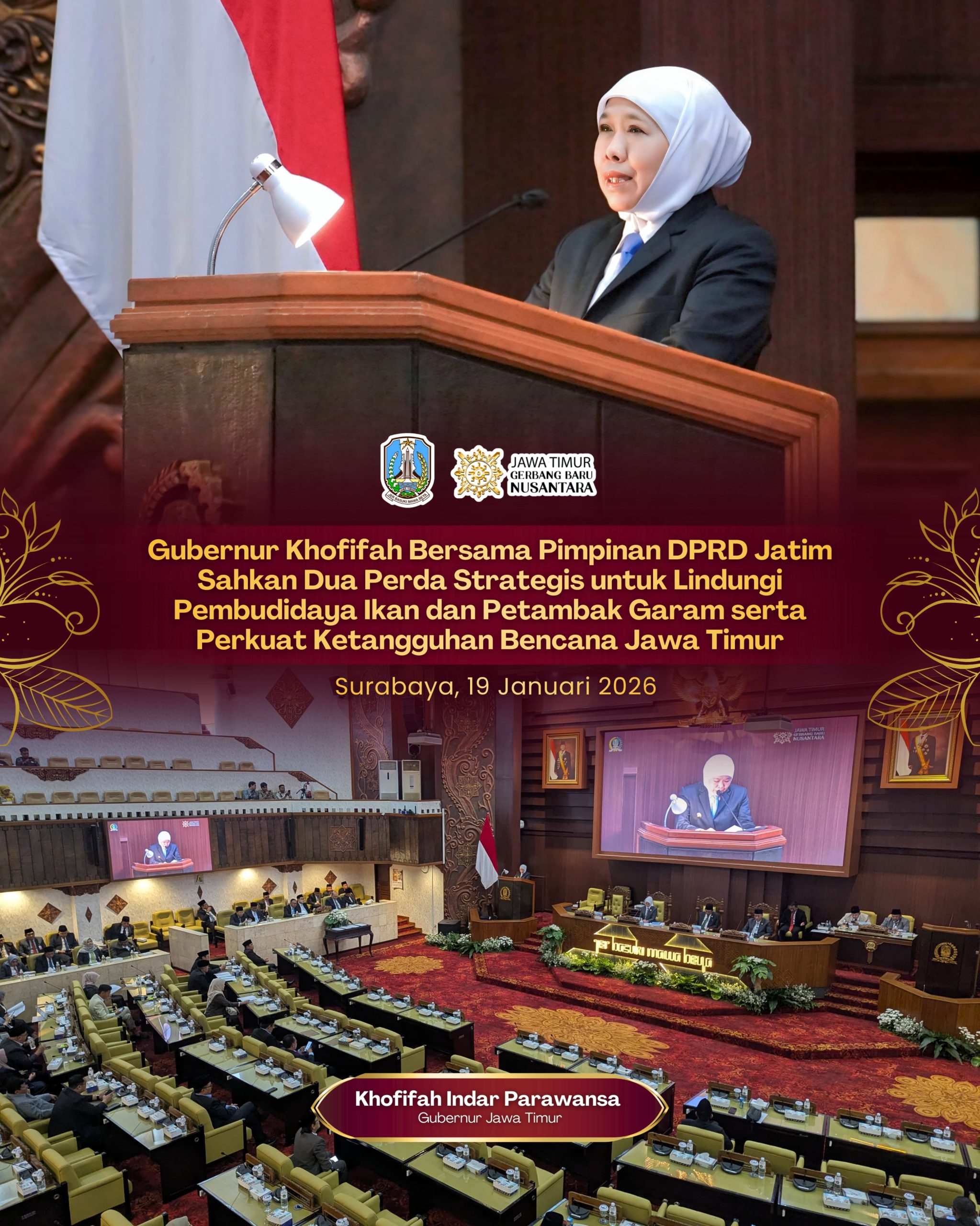 Harian Cakrawala – SURABAYA, 20 JANUARI 2026, Gubernur Jawa Timur Khofifah Indar Parawansa bersama Pimpinan DPRD Jatim resmi mengesahkan dua Peraturan Daerah (Perda) strategis dalam Rapat Paripurna di Gedung DPRD Provinsi Jawa Timur, Senin (19/1).