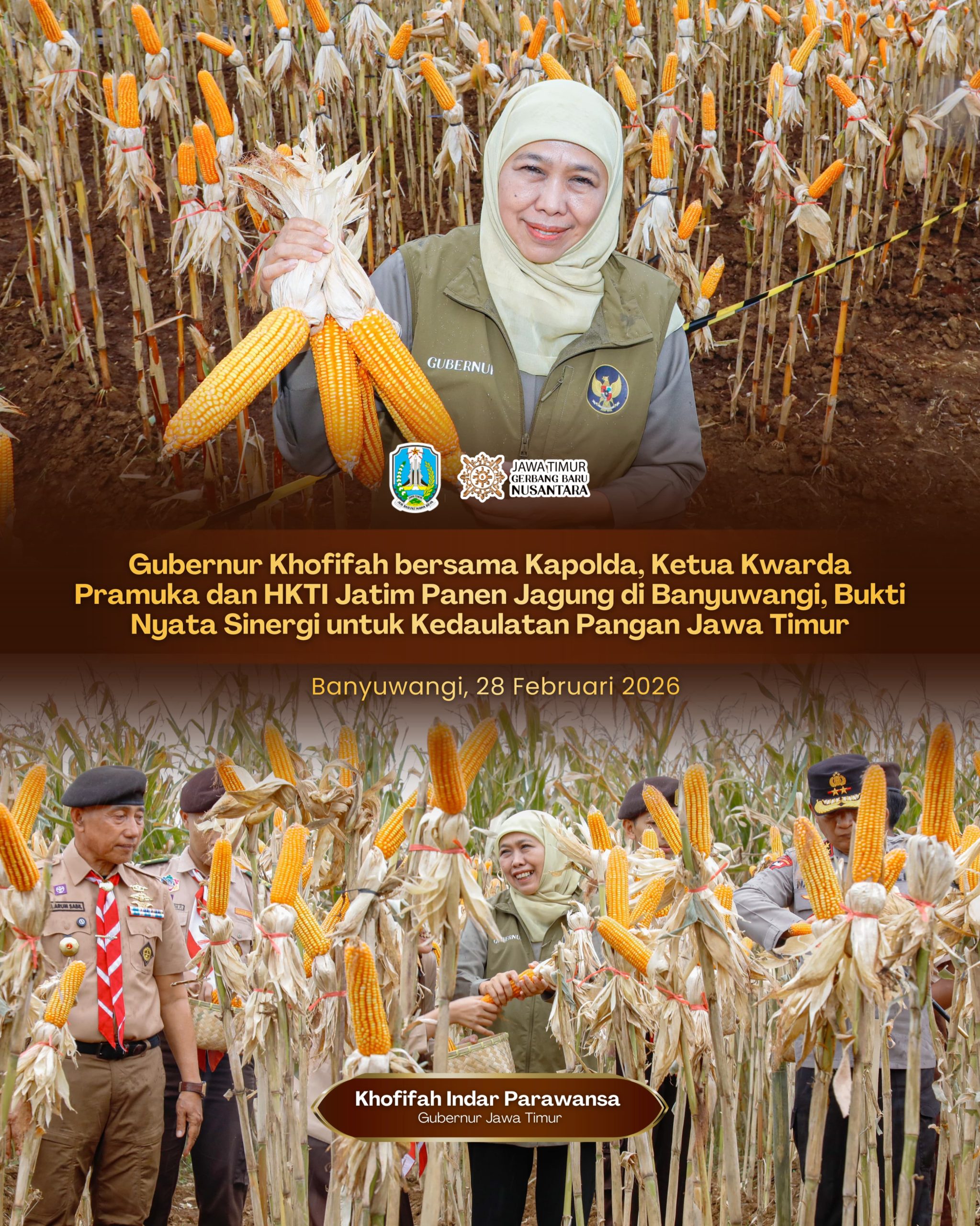 Harian Cakrawala – BANYUWANGI, 1 Maret 2026, Gubernur Jawa Timur Khofifah Indar Parawansa bersama Kapolda Jatim Irjen Pol Nanang Avianto, Bupati Banyuwangi Ipuk Fiestiandani, Ketua Kwarda Pramuka Jatim dan Ketua Himpunan Kerukunan Tani Indonesia (HKTI) Jatim H. M. Arum Sabil melaksanakan panen jagung hasil tanam kuartal IV Tahun 2025 di Pusat Pelatihan Pertanian Taruna Bumi, Green Farm, Desa Karangsari, Kecamatan Sempu, Kabupaten Banyuwangi, Sabtu (28/2).