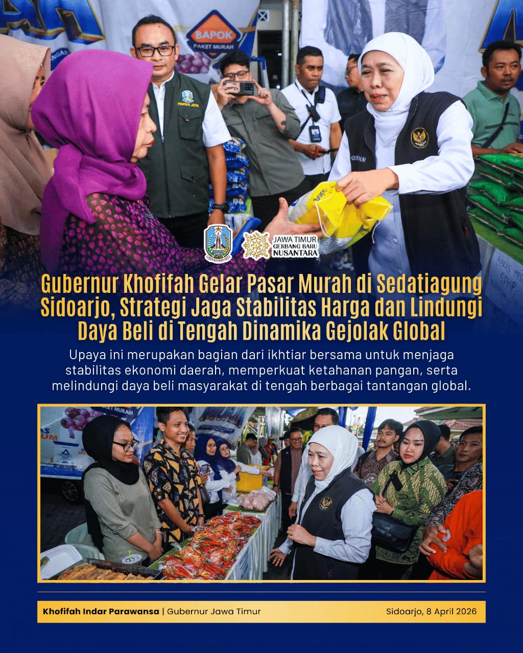 Harian Cakrawala – SIDOARJO, 11 APRIL 2026, Gubernur Jawa Timur Khofifah Indar Parawansa menegaskan komitmennya dalam menjaga stabilitas harga pangan sekaligus melindungi daya beli masyarakat melalui penyelenggaraan program Pasar Murah di berbagai kabupaten/kota di Jawa Timur.