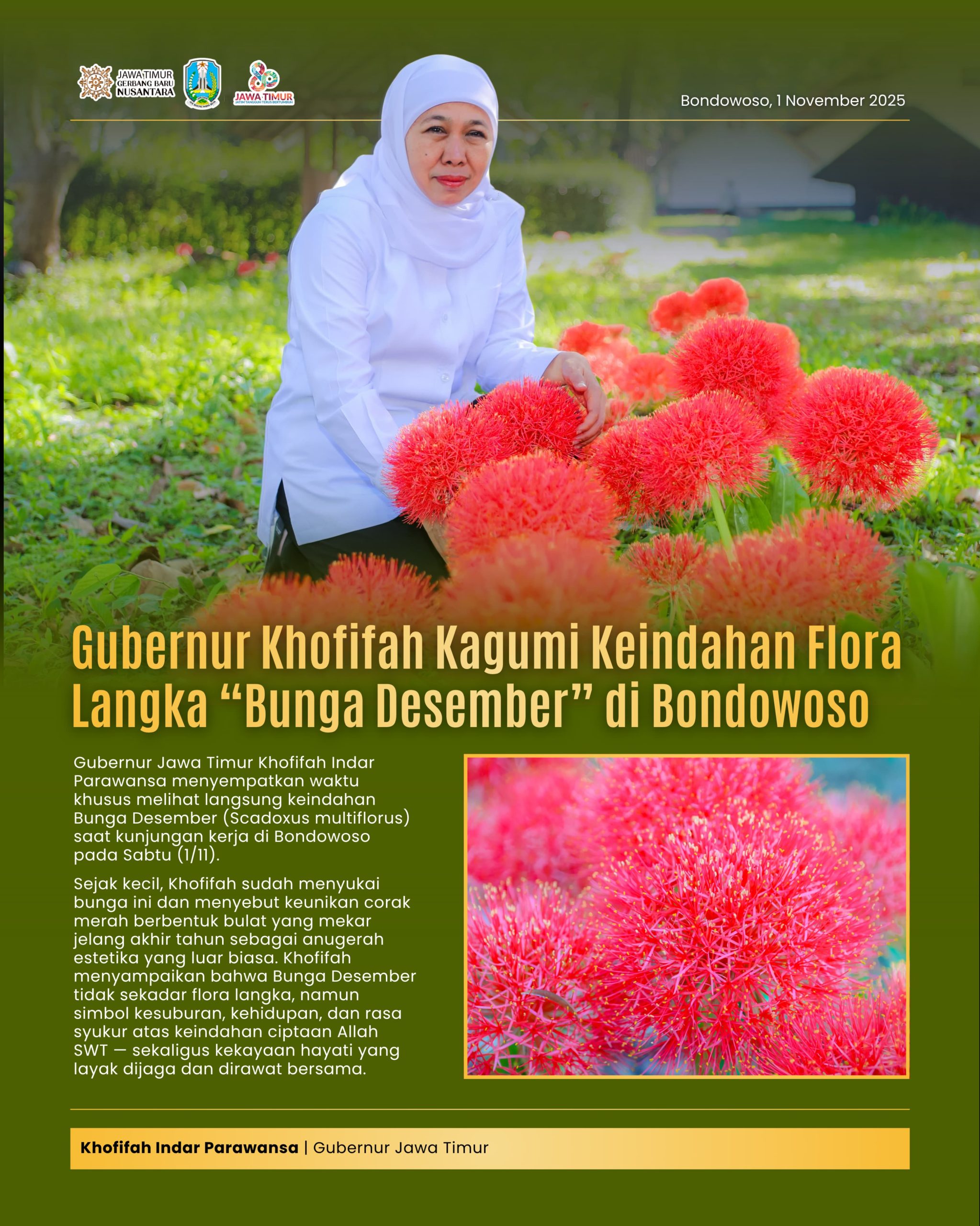 Harian Cakrawala – BONDOWOSO, 2 NOVEMBER 2025, Gubernur Jawa Timur Khofifah Indar Parawansa menyempatkan waktu untuk melihat langsung flora langka bernama “Bunga Desember” atau Scadoxus multiflorus di Pekarangan Rumah Dinas Asisten Perhutani (Asper) Bagian Kesatuan Pengelolaan Hutan (BKPH) Klabang, Bondowoso, Sabtu (1/11).