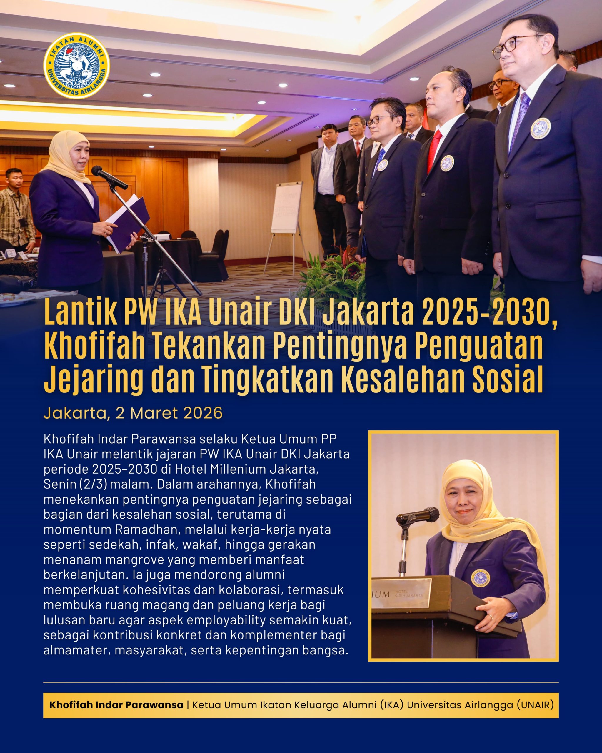 Harian Cakrawala – JAKARTA, 5 MARET 2026, Ketua Umum Pengurus Pusat (PP) Ikatan Alumni (IKA) Universitas Airlangga (UNAIR) yang juga Gubernur Jawa Timur Khofifah Indar Parawansa, secara resmi melantik jajaran Pengurus Wilayah (PW) IKA Unair DKI Jakarta periode 2025-2030 di Hotel Millenium Jakarta, Senin (2/3) malam.