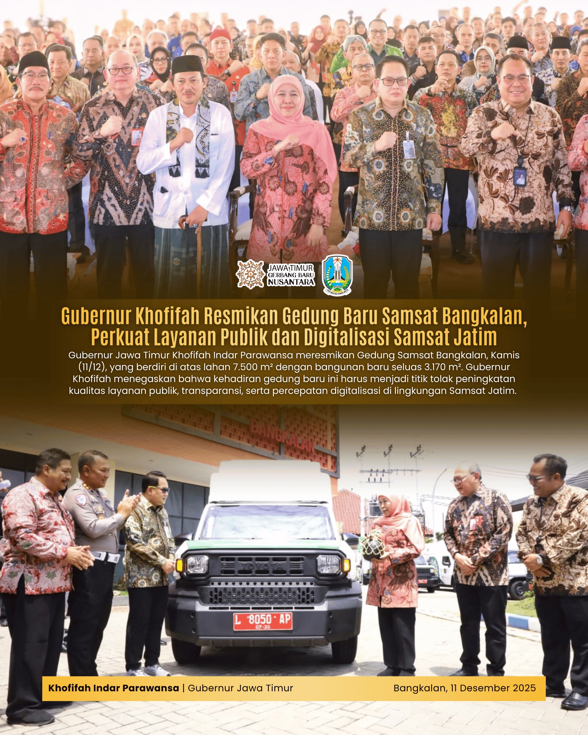 Harian Cakrawala – BANGKALAN, 11 DESEMBER 2025, Gubernur Jawa Timur Khofifah Indar Parawansa meresmikan Gedung Kantor Bersama Samsat Bangkalan, Kamis (11/12). Menempati lahan eks UPT Dinas Perhubungan Provinsi Jatim dengan luas lahan sebesar 7.500 m² dan luas bangunan 3.170 m², kantor ini diharapkan bisa menjadi penguat layanan publik dan digitalisasi Samsat Jatim.