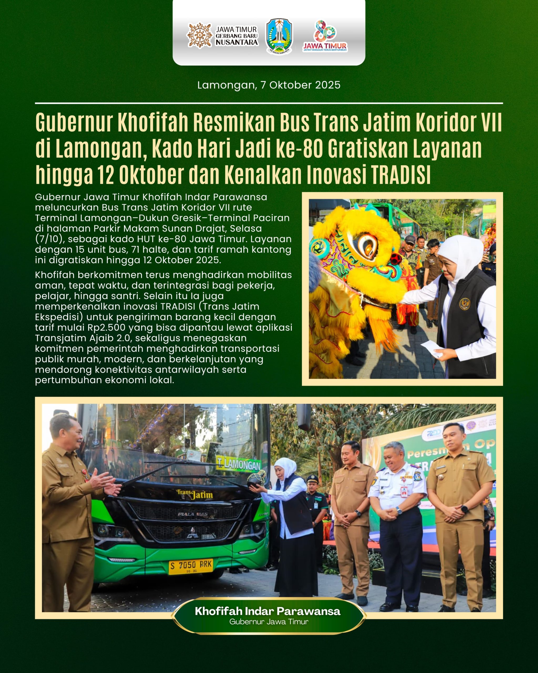 “Atas nama Pemerintah Provinsi Jawa Timur, kami menyampaikan terima kasih dan apresiasi kepada semua pihak yang telah berkontribusi dalam mewujudkan layanan Transjatim Koridor VII,” ujar Gubernur Khofifah.