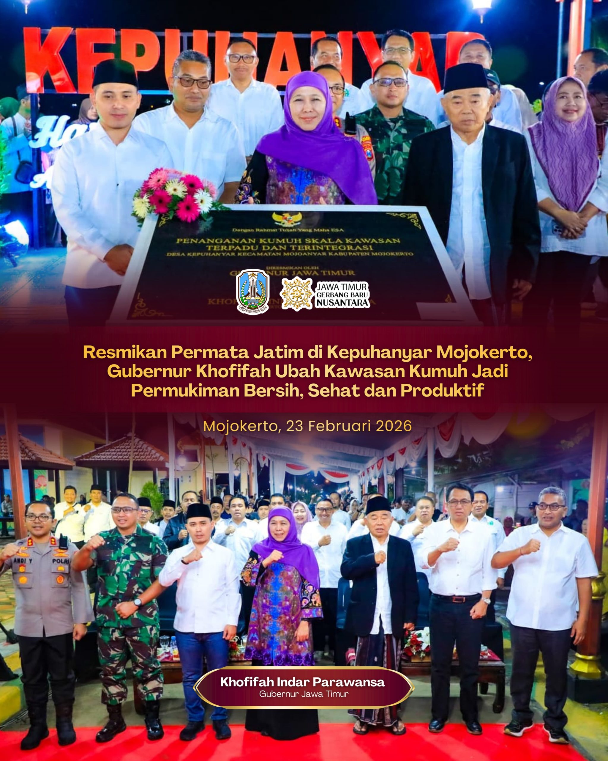 Harian Cakrawala – MOJOKERTO, 24 FEBRUARI 2026, Gubernur Jawa Timur Khofifah Indar Parawansa meresmikan Penanganan Kumuh Skala Kawasan Terpadu dan Terintegrasi melalui Program Permata Jatim di Desa Kepuhanyar, Kecamatan Mojoanyar, Kabupaten Mojokerto, Senin (23/2) malam.