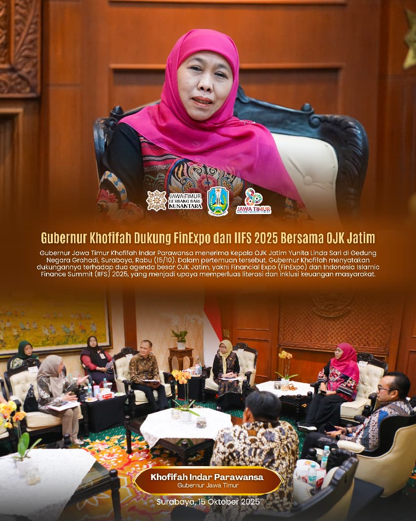 Harian Cakrawala – SURABAYA, 16 OKTOBER 2025, Gubernur Jawa Timur Khofifah Indar Parawansa menyampaikan komitmennya untuk mendukung penuh dua agenda besar yang akan diselenggarakan Otoritas Jasa Keuangan (OJK) Provinsi Jawa Timur, yakni Financial Expo (FinExpo) dan Indonesia Islamic Finance Summit (IIFS) 2025.