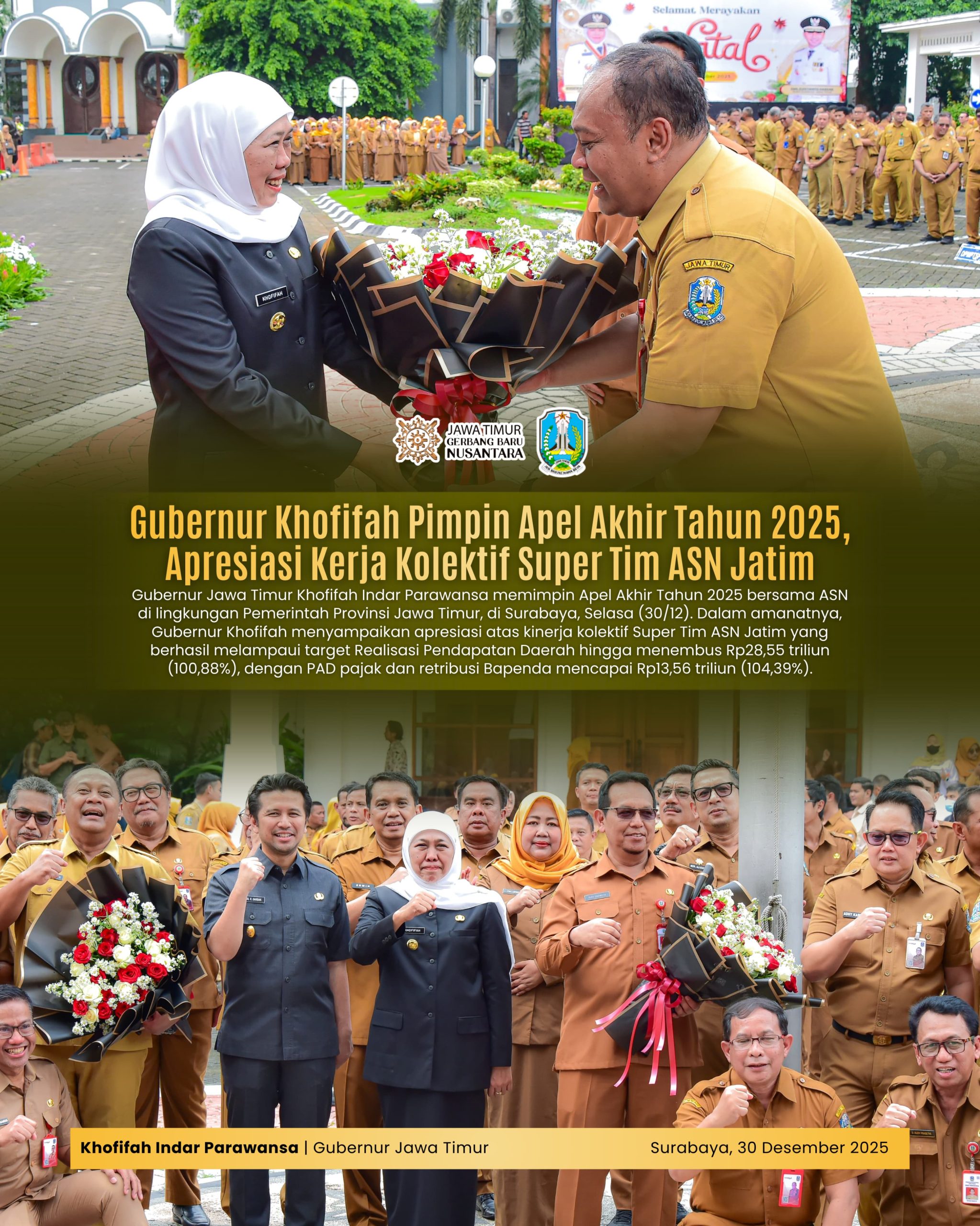 Gubernur Khofifah Pimpin Apel Akhir Tahun 2025, Apresiasi Kerja Kolektif Super Tim ASN Jatim