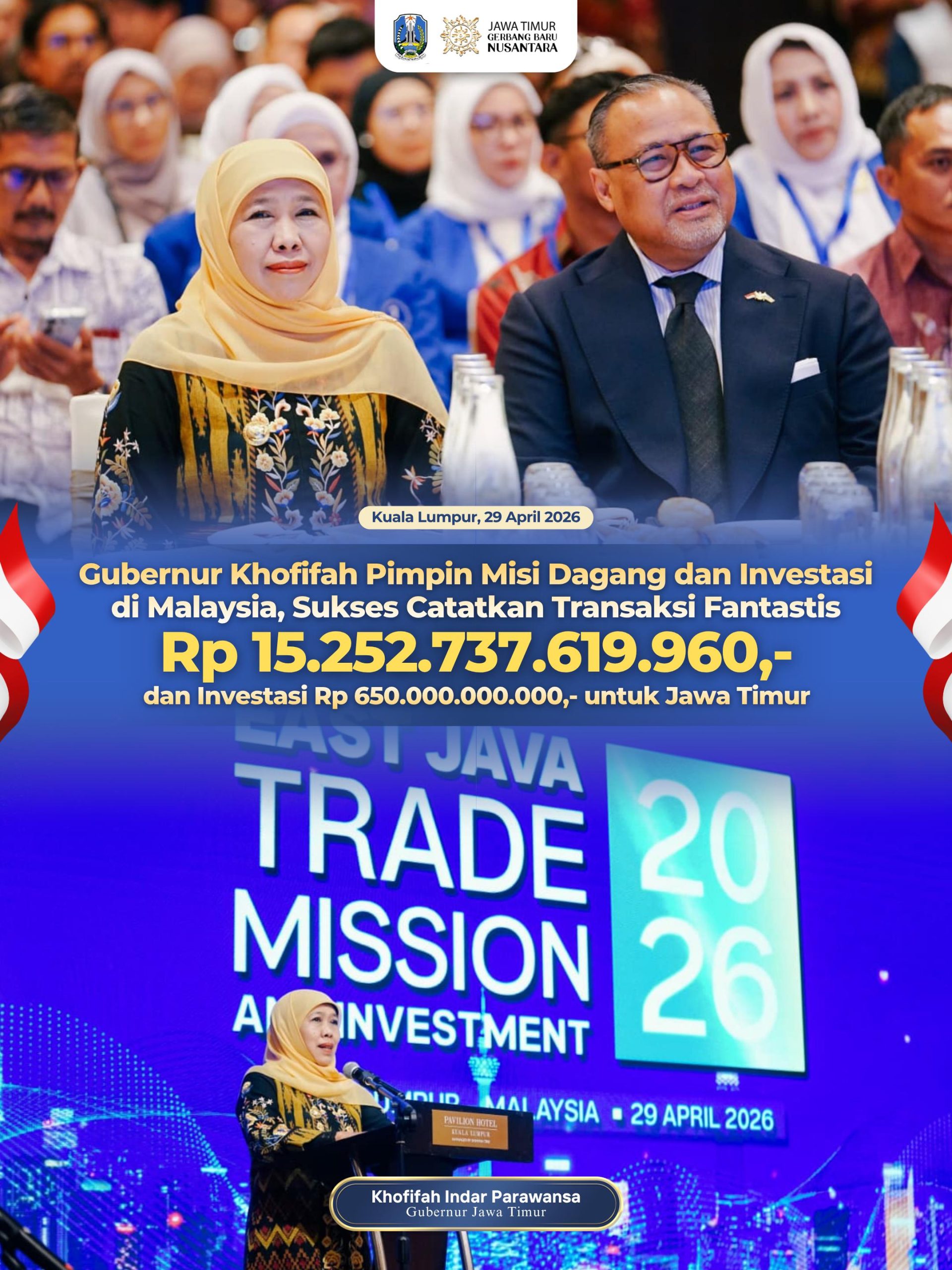 KUALA LUMPUR, 29 APRIL 2026, Gubernur Jawa Timur Khofifah Indar Parawansa memimpin langsung gelaran Misi Dagang dan Investasi (_East Java Trade and Investment Forum 2026_) dengan mencatatkan transaksi gemilang,
