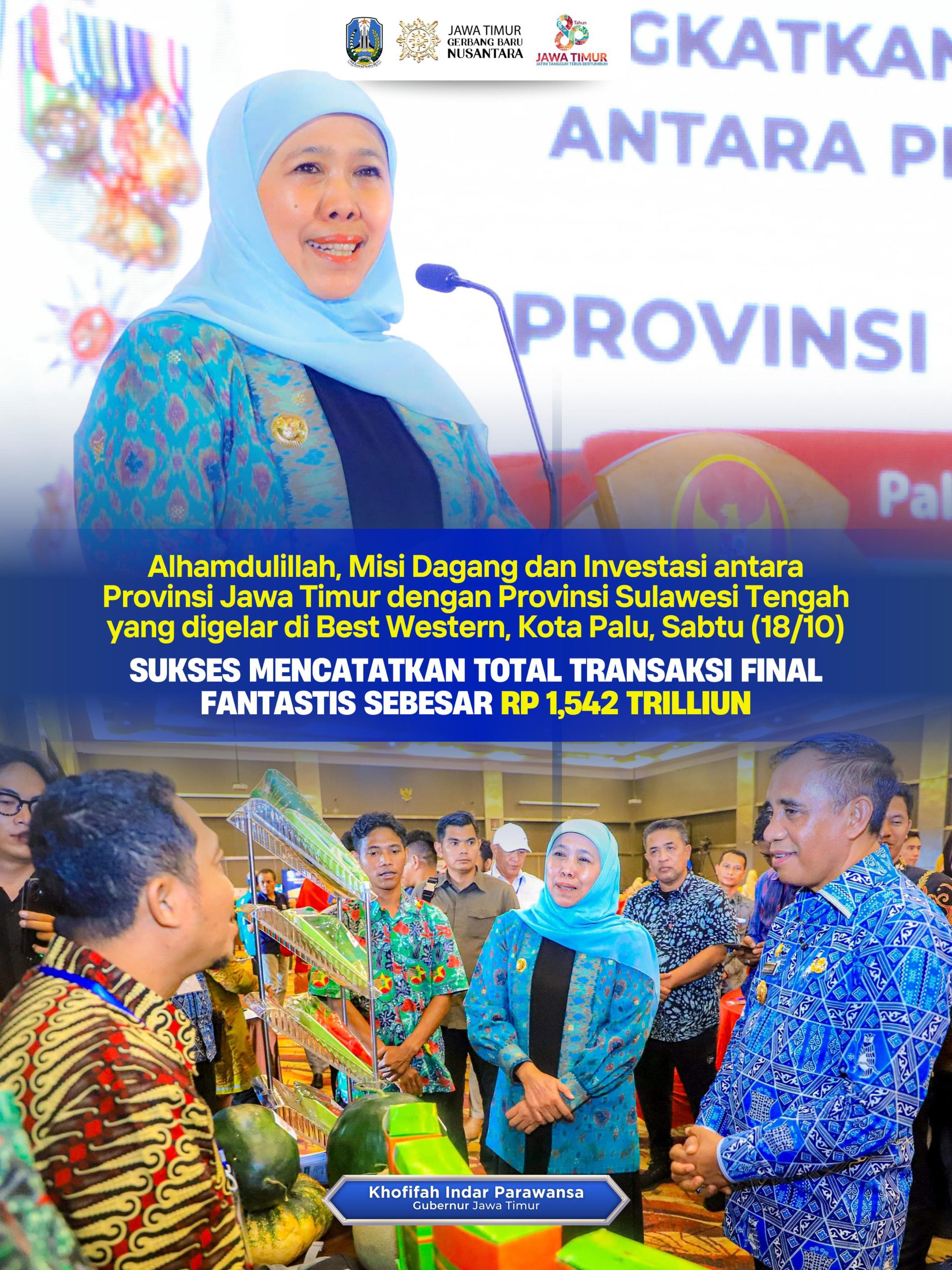 Harian Cakrawala – PALU, 19 OKTOBER 2025, Gubernur Jawa Timur Khofifah Indar Parawansa kembali mencatatkan prestasi membanggakan melalui gelaran Misi Dagang dan Investasi antara Provinsi Jawa Timur dengan Provinsi Sulawesi Tengah yang digelar di Best Western Plus Coco, Kota Palu, Sabtu (18/10).