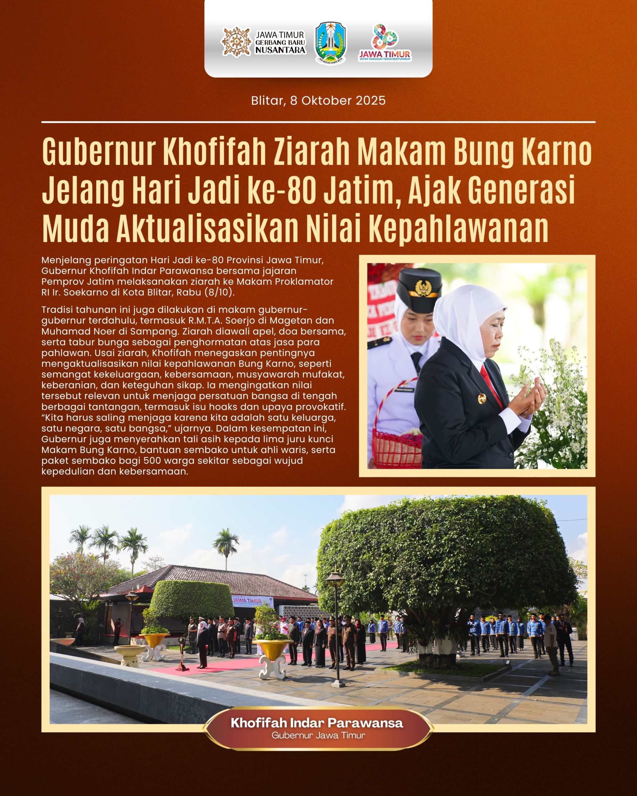 Harian Cakrawala – BLITAR, 8 OKTOBER 2025, Jelang Hari Jadi ke-80 Pemerintah Provinsi Jawa Timur, Gubernur Jawa Timur Khofifah Indar Parawansa berserta jajaran Pemprov Jatim ziarah makam Proklamator RI Soekarno di Jl. Ir. Soekarno No.152, Bendogerit, Kec. Sananwetan, Kota Blitar, Rabu (8/10).