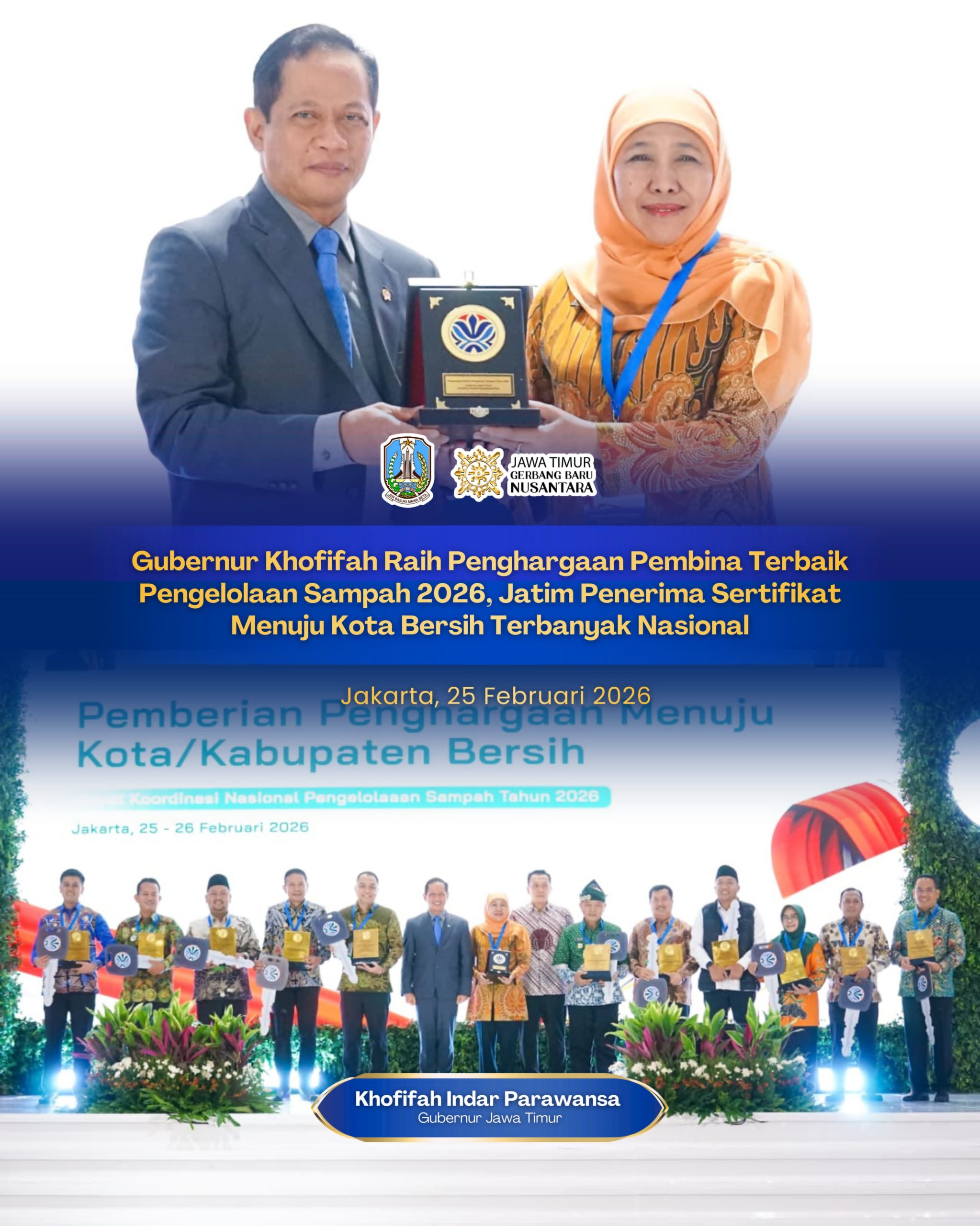 Hal itu pulalah yang mendasari diberikannya penganugerahan Penghargaan Kinerja Pengelolaan Sampah 2026 sebagai Pembina Terbaik Kabupaten/Kota pada Gubernur Khofifah.
