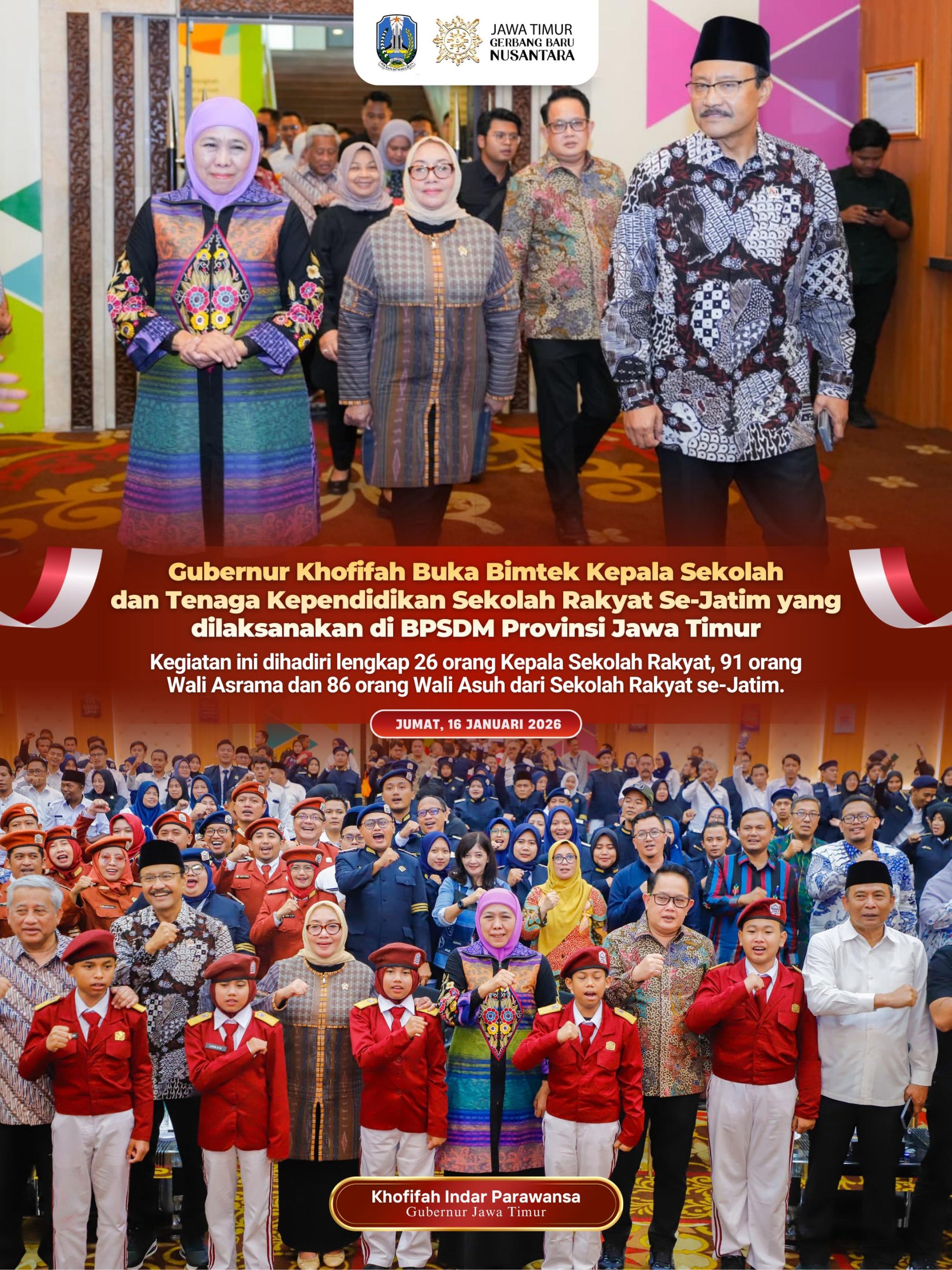 Harian Cakrawala – SURABAYA, 17 JANUARI 2026, Gubernur Jawa Timur Khofifah Indar Parawansa secara resmi membuka Bimbingan Teknis (Bimtek) Kepala Sekolah dan Tenaga Kependidikan (Tendik) Sekolah Rakyat (SR) se-Jawa Timur di BPSDM Provinsi Jawa Timur, Jumat (16/1).