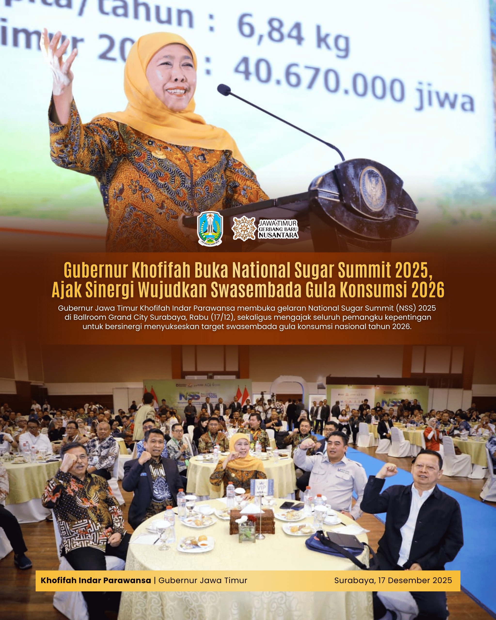Harian Cakrawala – SURABAYA, 17 DESEMBER 2025, Gubernur Jawa Timur Khofifah Indar Parawansa mengajak seluruh stakeholders bersama-sama mendukung dan menyukseskan program swasembada gula saat membuka gelaran National Sugar Summit (NSS) 2025 di Ballroom Grand City Convex Surabaya, Rabu (17/12).