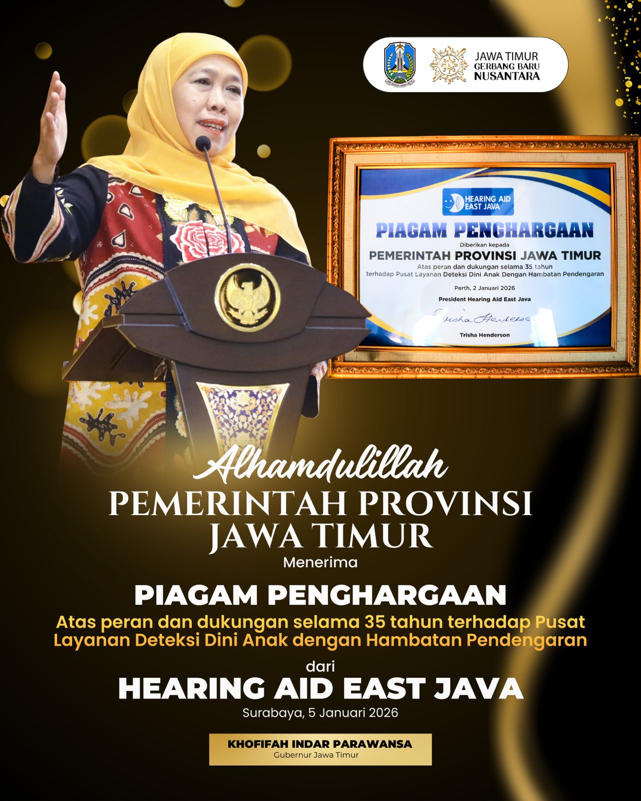 Harian Cakrawala – SURABAYA, 6 JANUARI 2025, Pemerintah Provinsi Jawa Timur menerima Piagam Penghargaan dari Hearing Aid East Java sebagai bentuk apresiasi atas peran aktif serta dukungan berkelanjutan Pemerintah Provinsi Jawa Timur selama 35 tahun dalam penguatan Pusat Layanan Deteksi Dini bagi anak-anak dengan hambatan pendengaran.