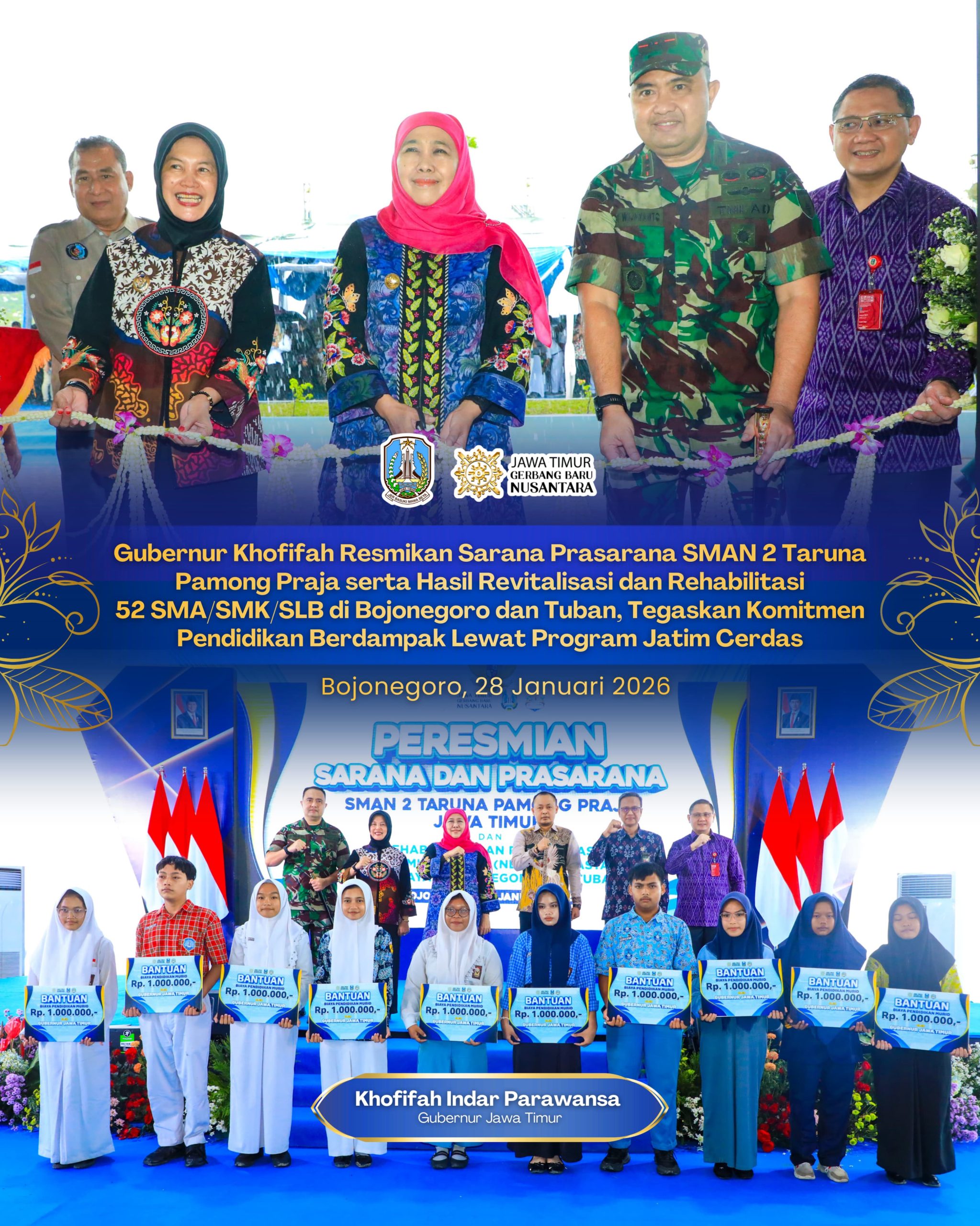Gubernur Khofifah Resmikan Sarana Prasarana SMAN 2 Taruna Pamong Praja serta Revitalisasi dan Rehabilitasi 52 SMA/SMK/SLB di Bojonegoro–Tuban