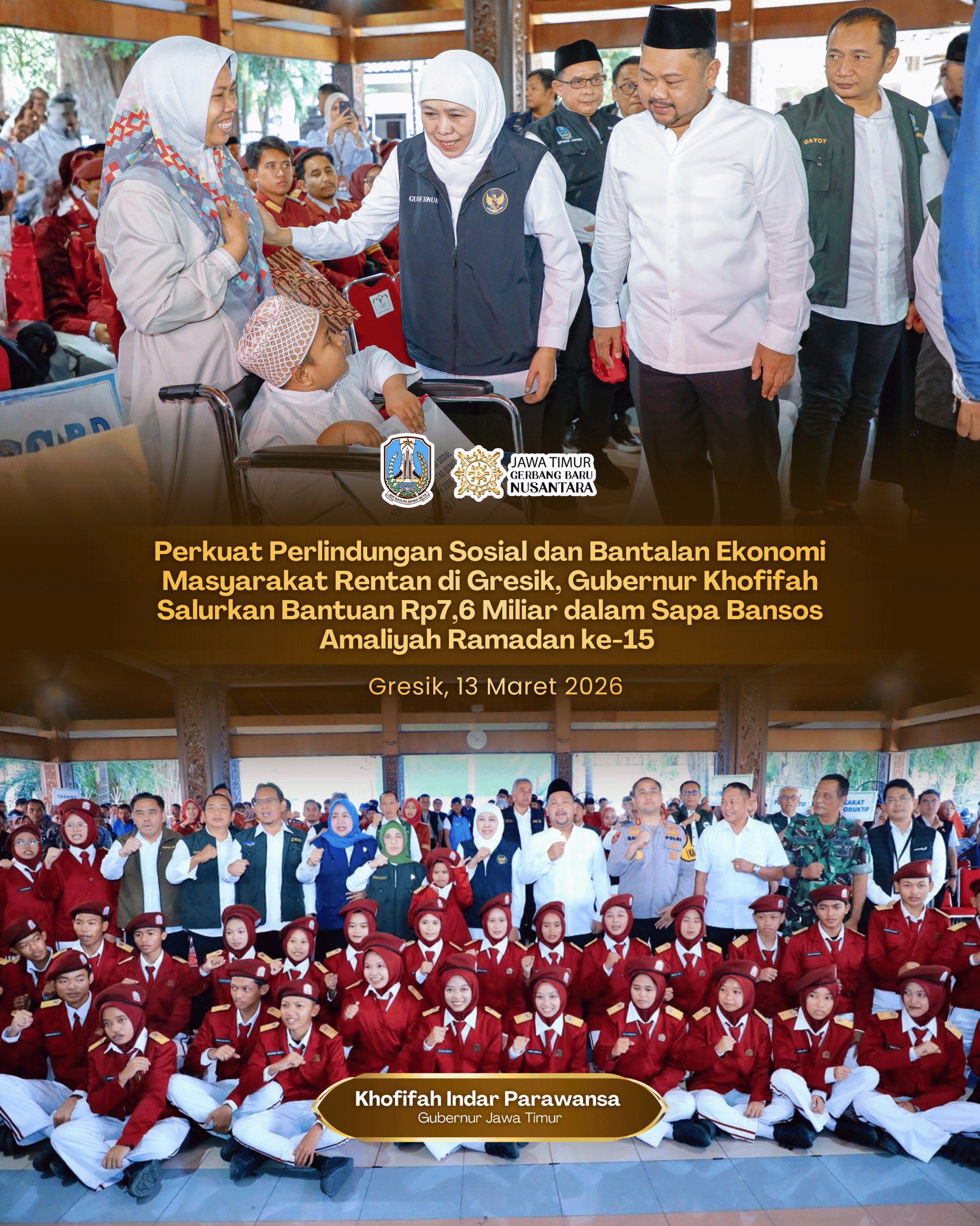 Harian Cakrawala – GRESIK, 14 MARET 2026, Gubernur Jawa Timur Khofifah Indar Parawansa melanjutkan rangkaian kegiatan Sapa Bansos Amaliyah Ramadan. Di titik ke-15 ini, Gubernur Khofifah menyalurkan bantuan sosial (bansos) kepada masyarakat Kabupaten Gresik senilai Rp7.607.800.000 di Pendopo Kabupaten Gresik, Jumat (13/3).