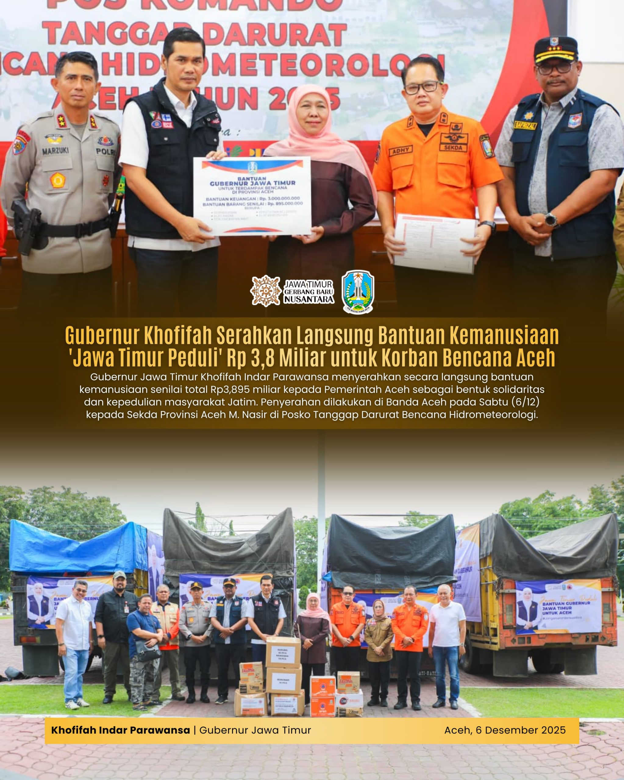 Harian Cakrawala – BANDA ACEH, 6 DESEMBER 2025, Gubernur Jawa Timur Khofifah Indar Parawansa bertolak ke Aceh untuk menyerahkan langsung bantuan dari Pemerintah Provinsi dan masyarakat Jawa Timur untuk masyarakat korban bencana hidrometeorologi di Aceh, Sabtu (6/12).