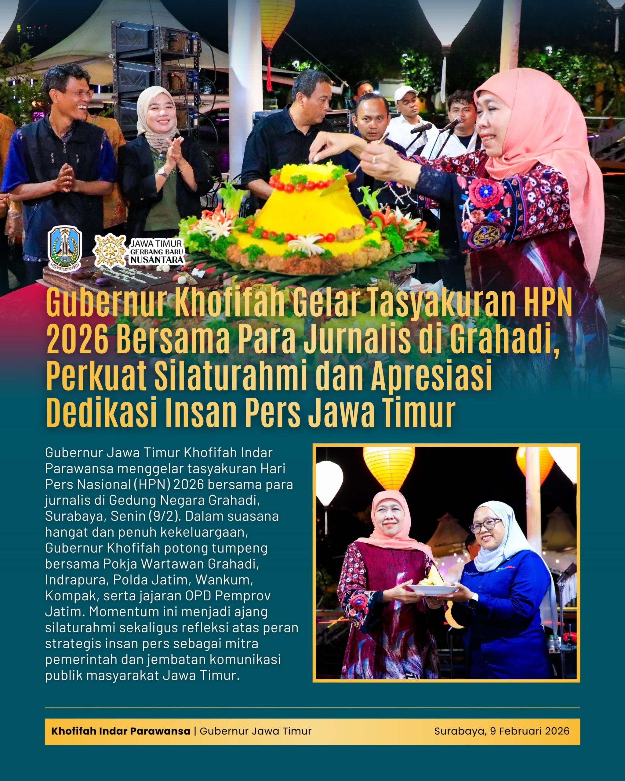“Kami menyampaikan terima kasih atas perhatian Ibu Gubernur yang setiap tahun menyelenggarakan tasyakuran HPN. Ini menjadi bukti nyata kepedulian dan perhatian Gubernur Khofifah kepada insan pers di Jawa Timur. Semoga sinergi yang terbangun terus terjaga dengan baik,” ungkapnya.