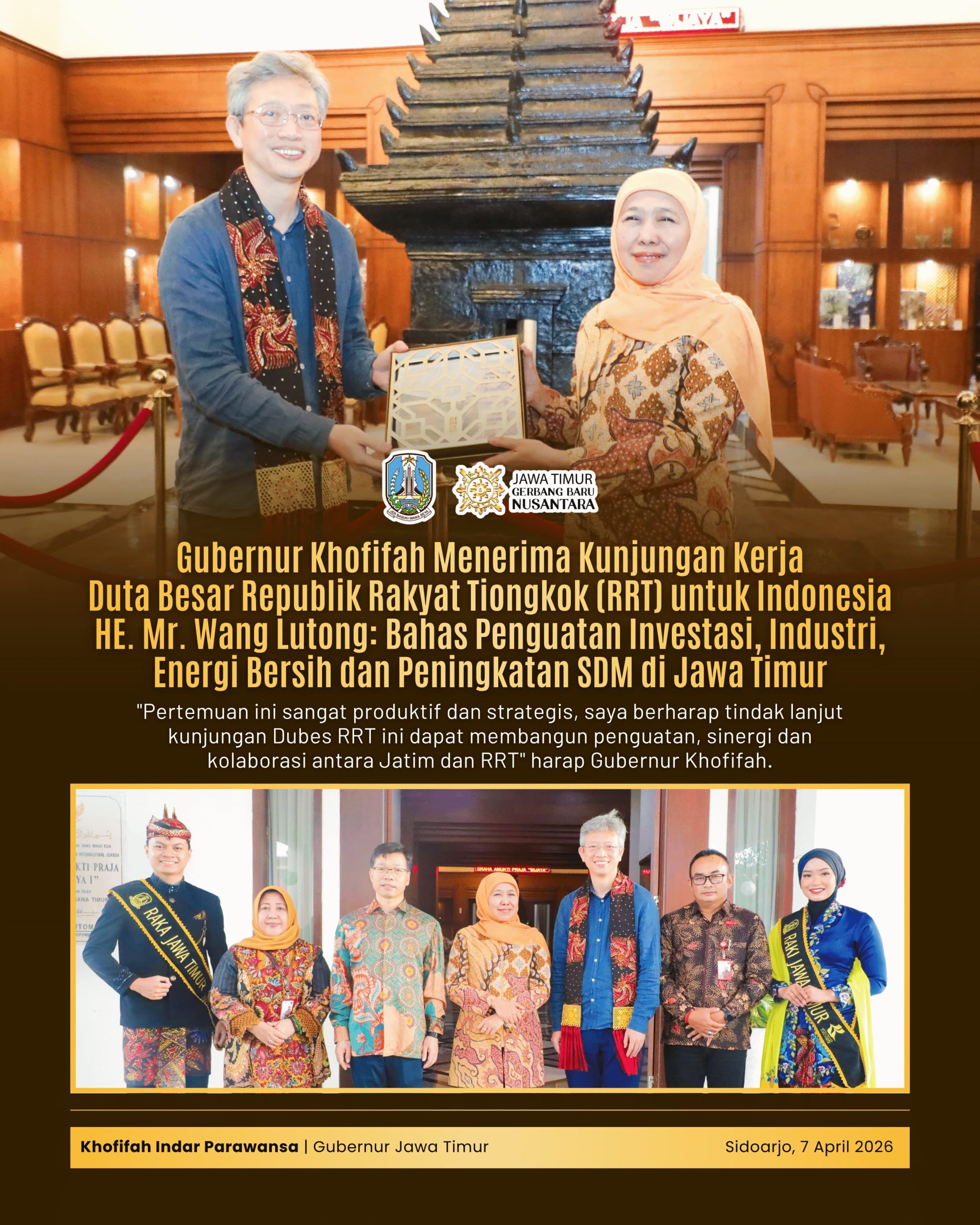 Sementara itu, Dubes Tiongkok untuk Indonesia HE. Mr. Wang Lutong menyampaikan apresiasi atas capaian pembangunan di Jawa Timur di bawah kepemimpinan Gubernur Khofifah. Ia menilai Jawa Timur memiliki potensi besar sebagai tujuan investasi dan mitra strategis dalam berbagai sektor.