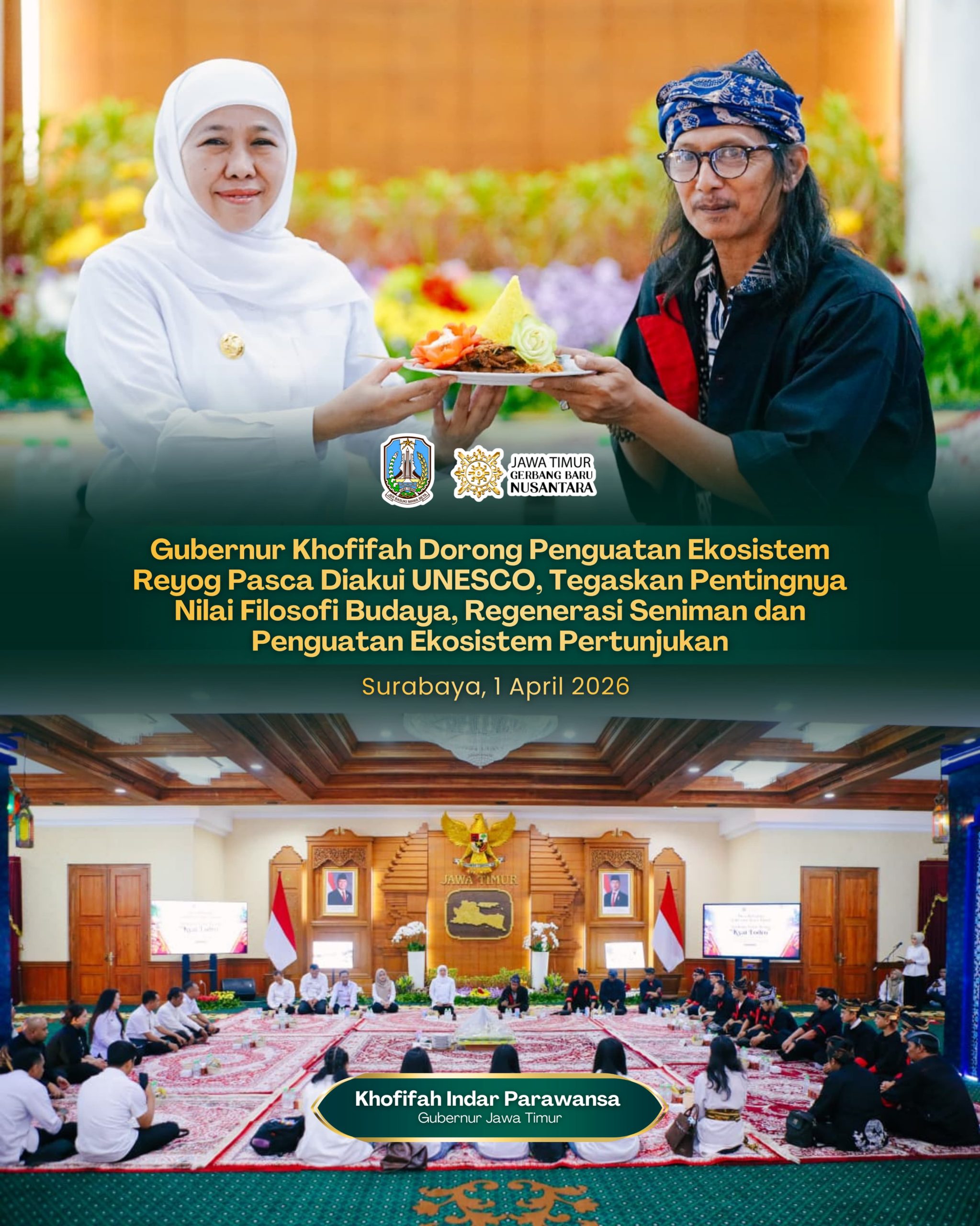 Harian Cakrawala – SURABAYA, 14 APRIL 2026, Gubernur Jawa Timur Khofifah Indar Parawansa menegaskan pentingnya penguatan ekosistem kesenian Reyog sebagai warisan budaya dunia yang berkelanjutan, pasca ditetapkannya Reyog Ponorogo sebagai Warisan Budaya Takbenda (WBTb) UNESCO.