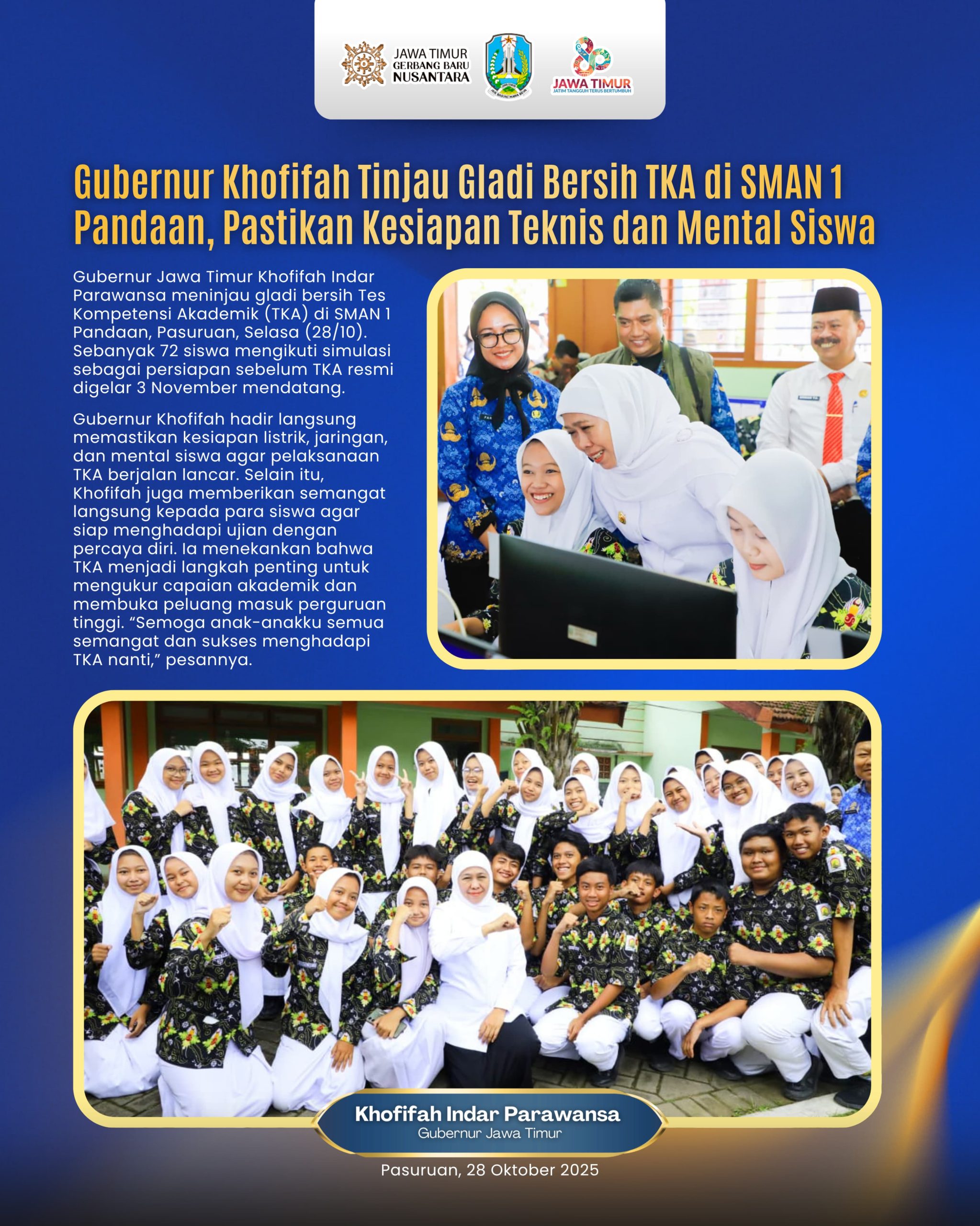 “Hari ini saya ingin memastikan seluruh kesiapan menjelang TKA pada tanggal 3 November besok. Mulai dari listrik, jaringan internet juga kesiapan mental para siswa,” ujar Khofifah.