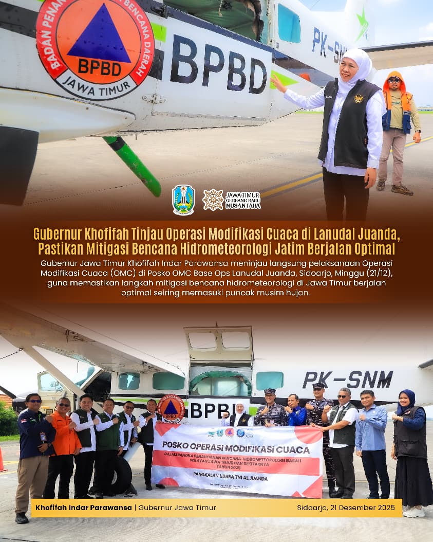 Gubernur Khofifah menyampaikan bahwa Operasi Modifikasi Cuaca di Jawa Timur telah dimulai sejak 5 Desember 2025 dan hingga saat ini telah dilakukan sebanyak 30 kali sortie selama 17 hari masa OMC yang telah berjalan. OMC merupakan hasil kolaborasi antara Pemerintah Provinsi Jawa Timur melalui BPBD Jatim, Lanudal Juanda, BMKG, serta PT Milan Pillery Bersatu selaku operator modifikasi cuaca.
