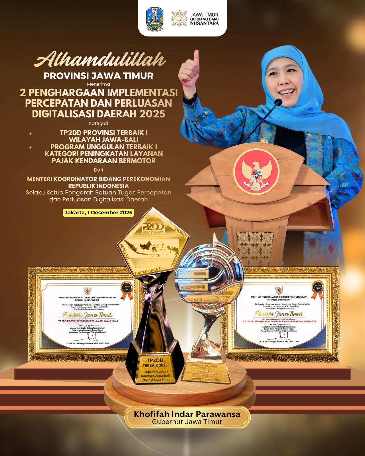 Jatim Sabet TP2DD Terbaik Jawa–Bali dan Program Pajak Kendaraan Terinovatif, Khofifah Tegaskan Digitalisasi Fiskal Makin Efektif