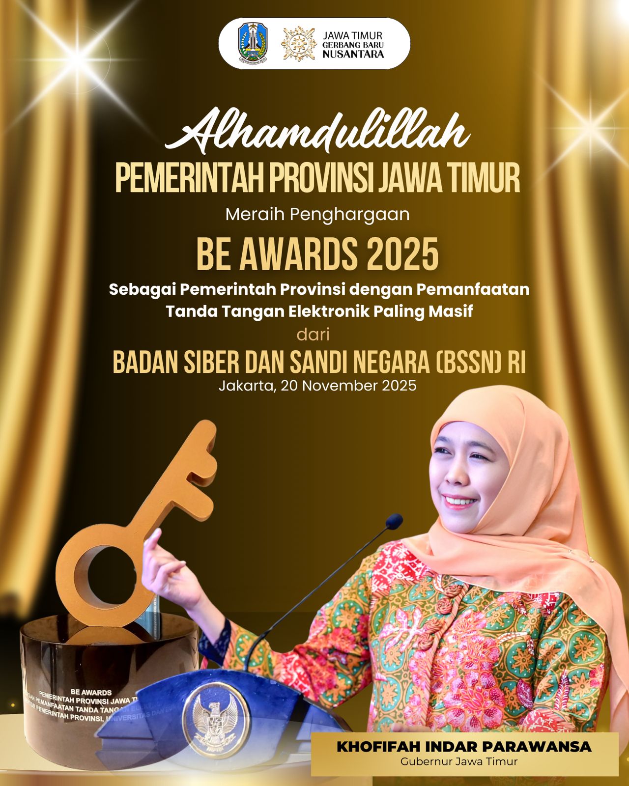 Pemprov Jatim meraih penghargaan Be Award 2025 untuk Kategori Instansi dengan Pemanfaatan Tanda Tangan Elektronik Paling Masif.