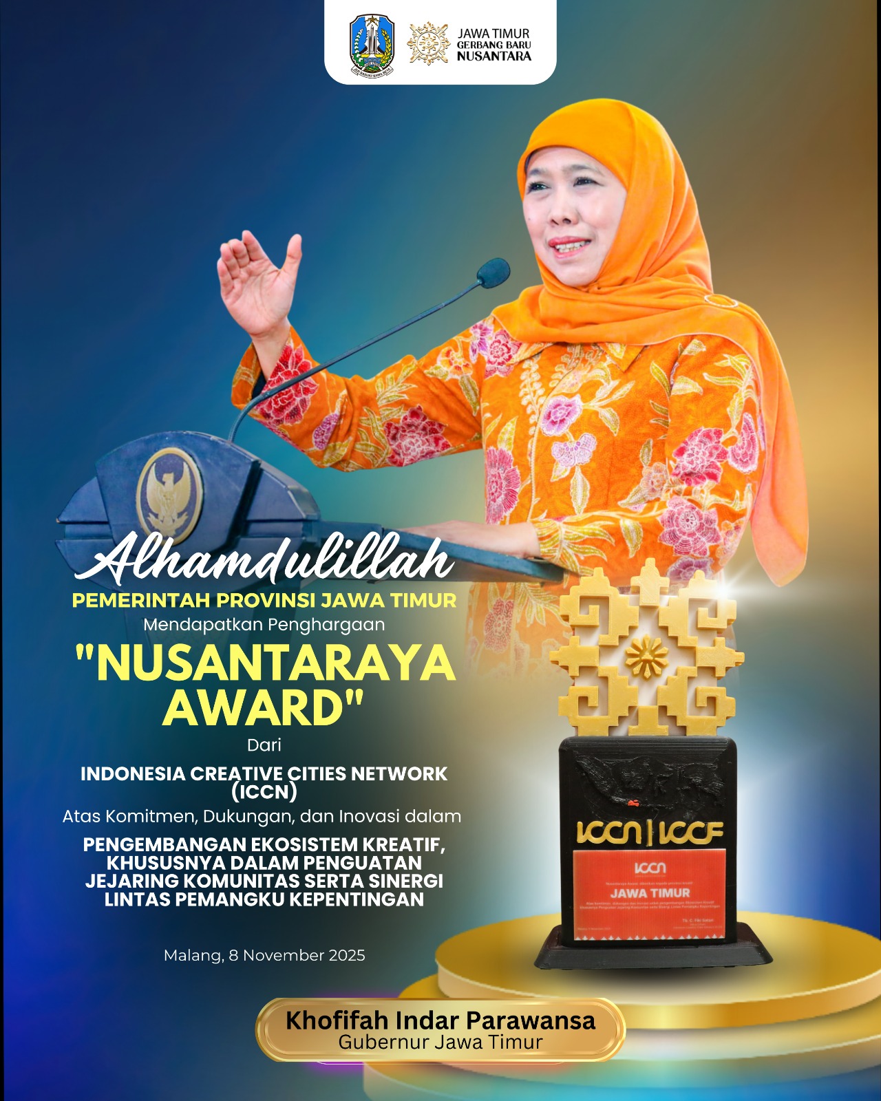 “Alhamdulillah Jatim berhasil meraih penghargaan Nusantaraya Award dari ICCN. Salah satu alasan kuat adalah karena Jatim memiliki komitmen, dukungan dan inovasi dalam pengembangan ekosistem kreatif, khususnya dalam penguatan jejaring dan sinergi lintas pemangku kepentingan.” tutur Gubernur Khofifah saat di Gedung Negara Grahadi Surabaya pada Sabtu (8/11).
