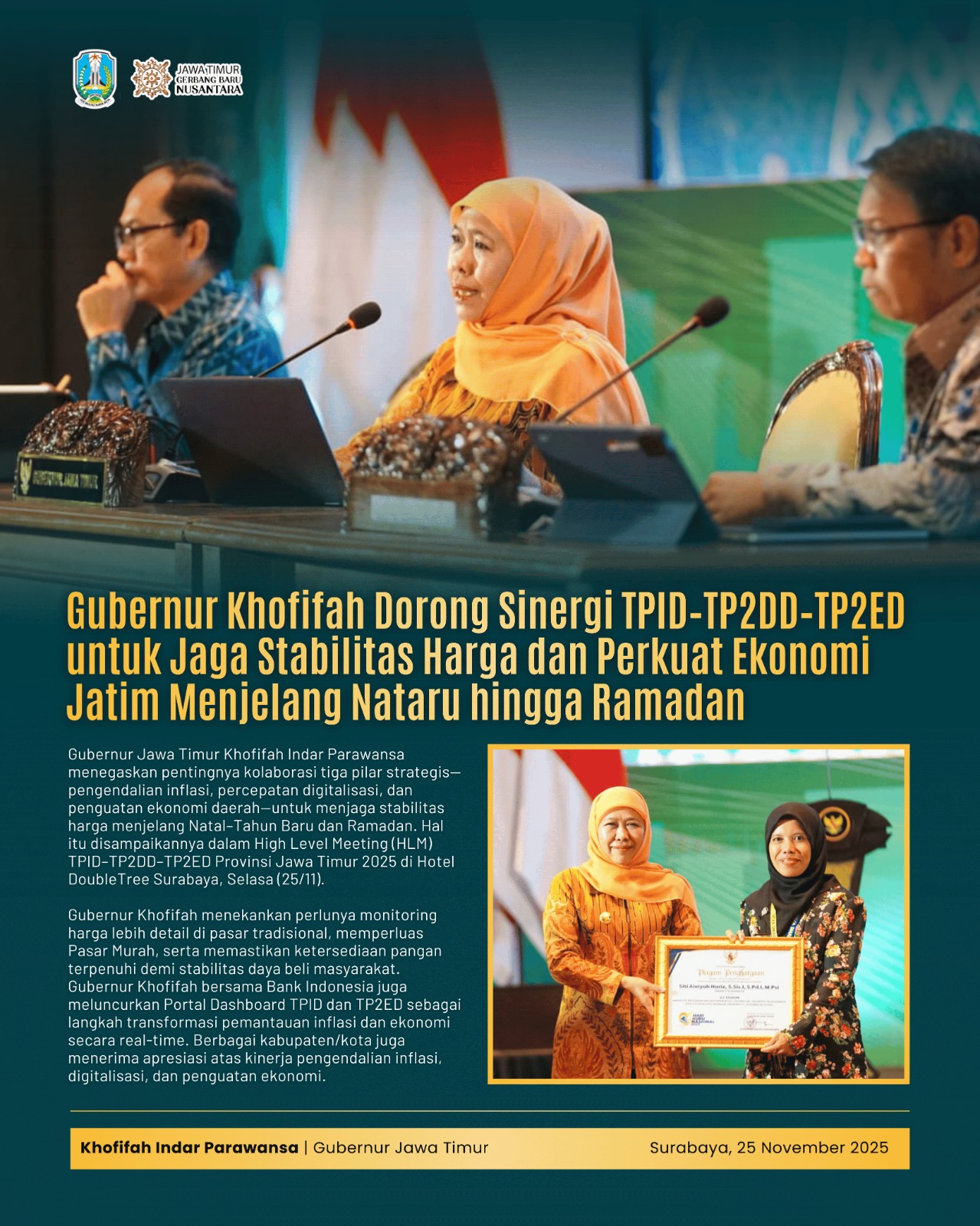 Harian Cakrawala – SURABAYA, 25 NOVEMBER 2025, Gubernur Jawa Timur Khofifah Indar Parawansa mendorong sinergi TPID (Tim Pengendalian Inflasi Daerah), TP2DD (Tim Percepatan dan Perluasan Digitalisasi Daerah) dan TP2ED (Tim Percepatan Pertumbuhan Ekonomi Daerah) untuk Percepatan Pertumbuhan ekonomi dan menjaga stabilisasi harga serta kendalikan inflasi di Jatim khususnya menjelang Natal dan Tahun Baru hingga Bulan Ramadhan dan Idul Fitri 1447 H.