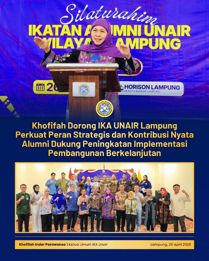 Harian Cakrawala – LAMPUNG, 26 APRIL 2026, Ketua Umum PP IKA Universitas Airlangga (UNAIR) yang juga Gubernur Jawa Timur Khofifah Indar Parawansa mengajak Pengurus Wilayah (PW) IKA UNAIR Provinsi Lampung untuk terus meningkatkan kontribusi nyata alumni dalam mendukung, mempertahankan, sekaligus memperkuat posisi UNAIR di tingkat nasional maupun global.