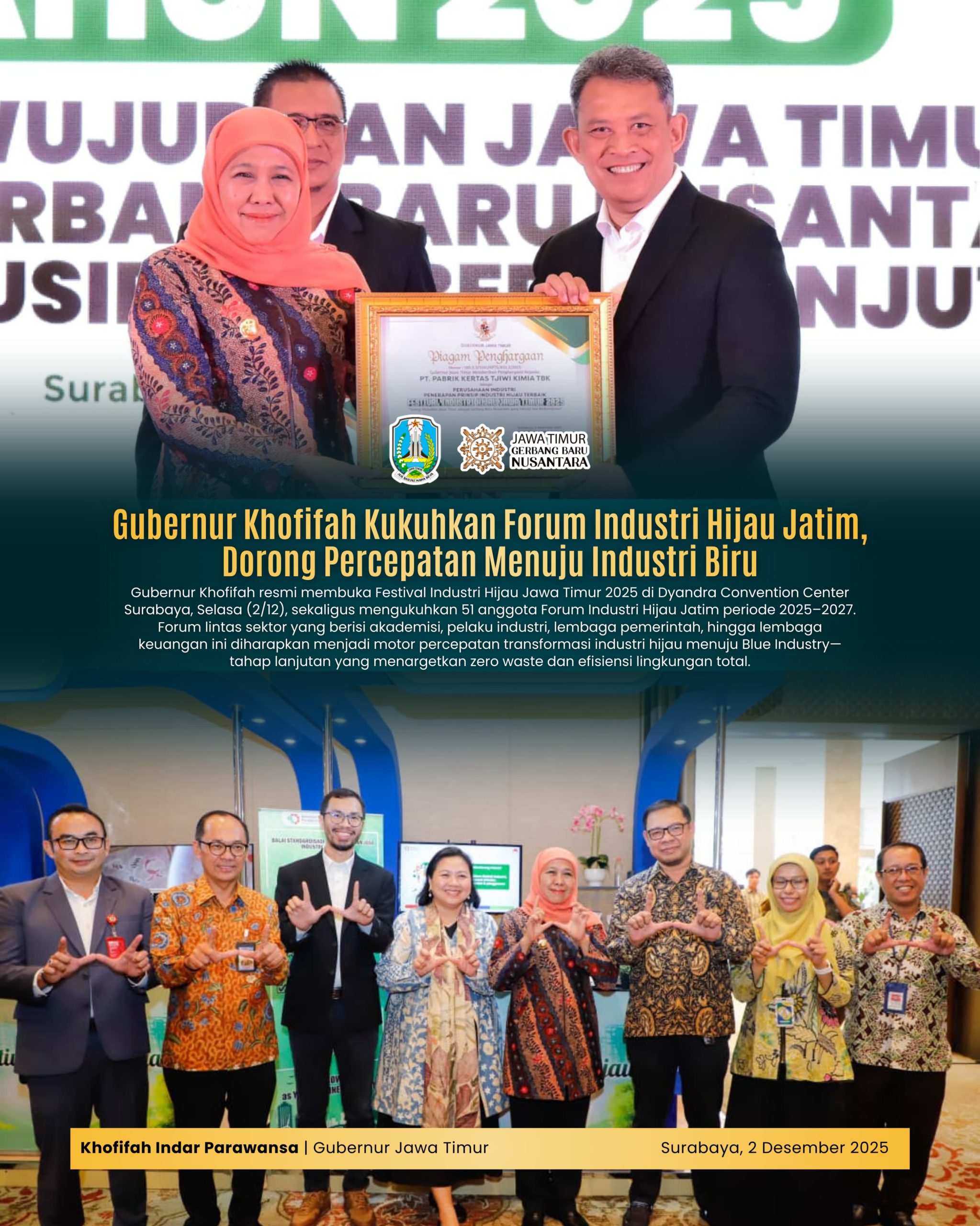 Harian Cakrawala – SURABAYA, 2 DESEMBER 2025, Gubernur Jawa Timur Khofifah Indar Parawansa mengukuhkan 51 orang anggota Forum Industri Hijau Jawa Timur periode 2025-2027.