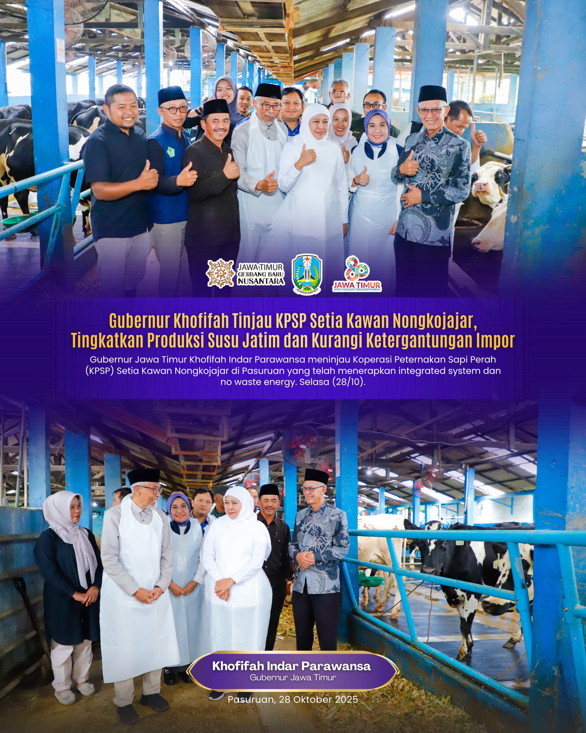 Harian Cakrawala – PASURUAN , 29 OKTOBER 2025, Gubernur Jawa Timur Khofifah Indar Parawansa meninjau Koperasi Peternakan Sapi Perah (KPSP) Setia Kawan Nongkojajar yang telah menerapkan _integrated farming_ dan masuk kategori menuju _No Waste Energy_ di Wonosari, Kecamatan Tutur, Kabupaten Pasuruan, Selasa (28/10).