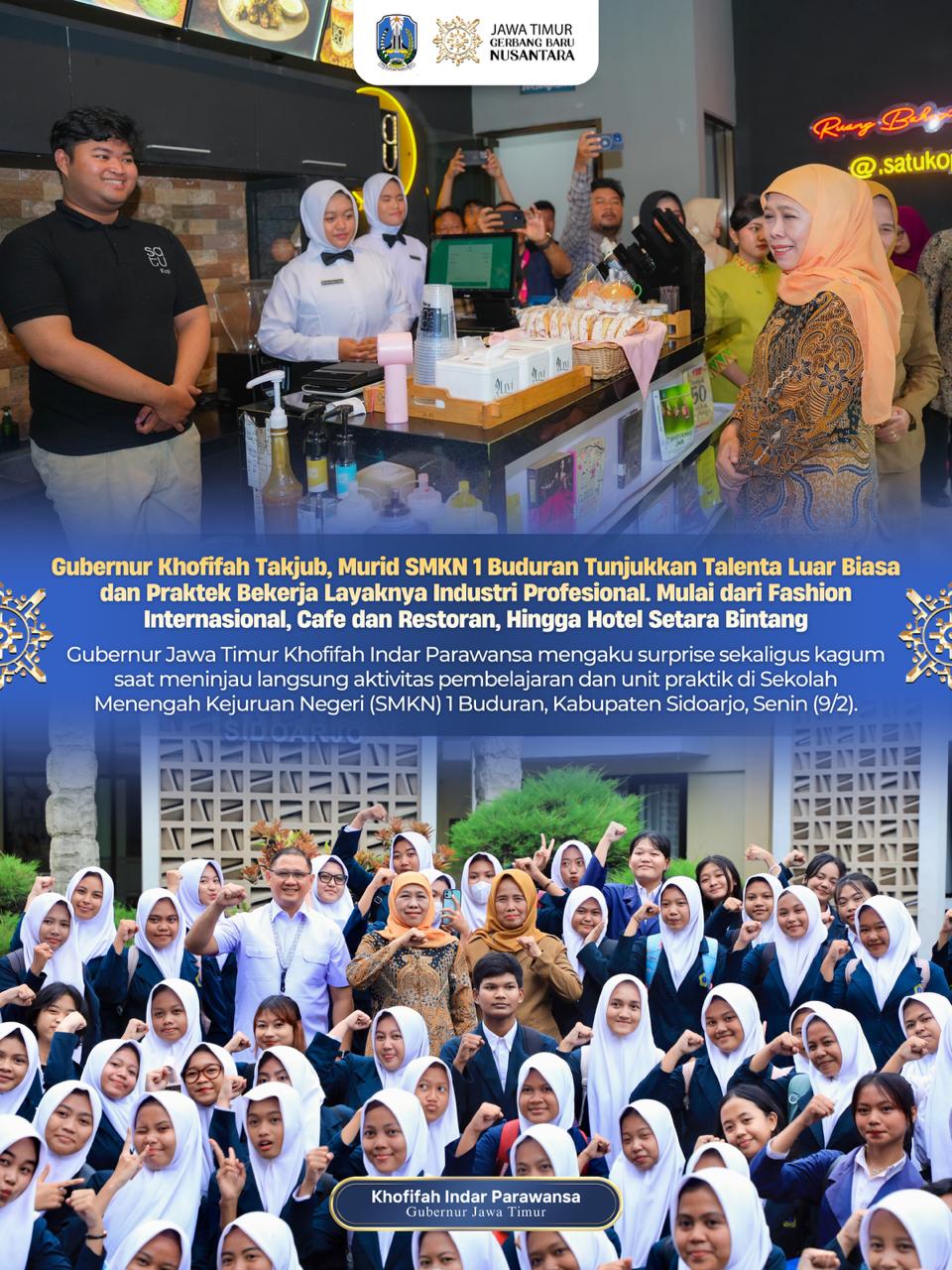 “Terus terang saya takjub. Anak-anak ini bukan sekadar belajar, tapi sudah bekerja seperti di industri yang sebenarnya. Cara mereka melayani, memproduksi, memasarkan, hingga menjaga kualitas, semuanya menunjukkan kesiapan masuk dunia kerja dan dunia usaha,” ujar Gubernur Khofifah.