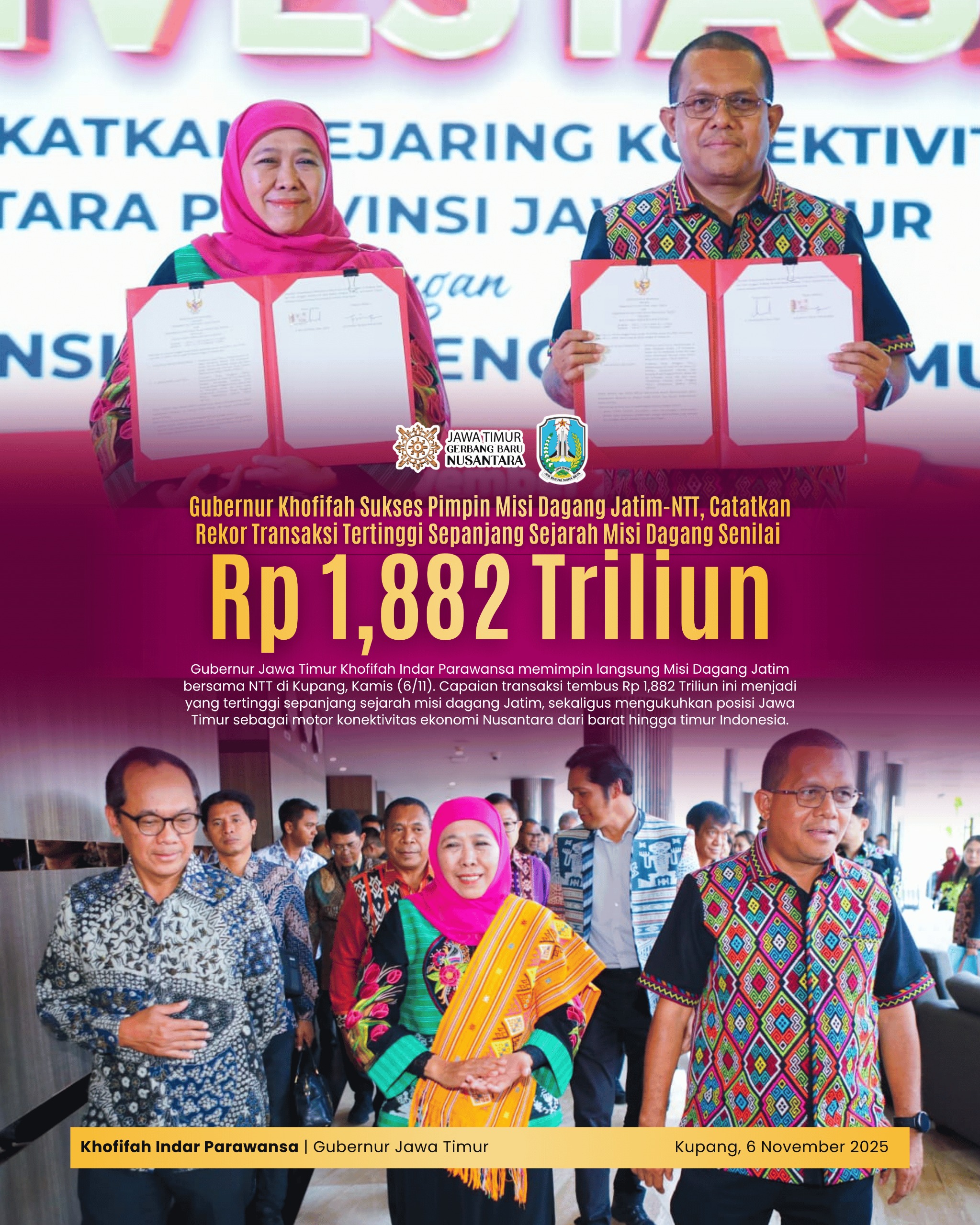 Gelaran Misi Dagang Jatim-NTT berhasil membukukan transaksi dengan angka Rp. 1.882.272.300.000. Capaian ini merupakan yang tertinggi sepanjang sejarah Pemprov Jatim menggelar misi dagang. Dengan demikian dalam pelaksanaan misi dagang di 10 provinsi pada tahun 2025, transaksi total mencapai Rp. 10,77 Triliun.