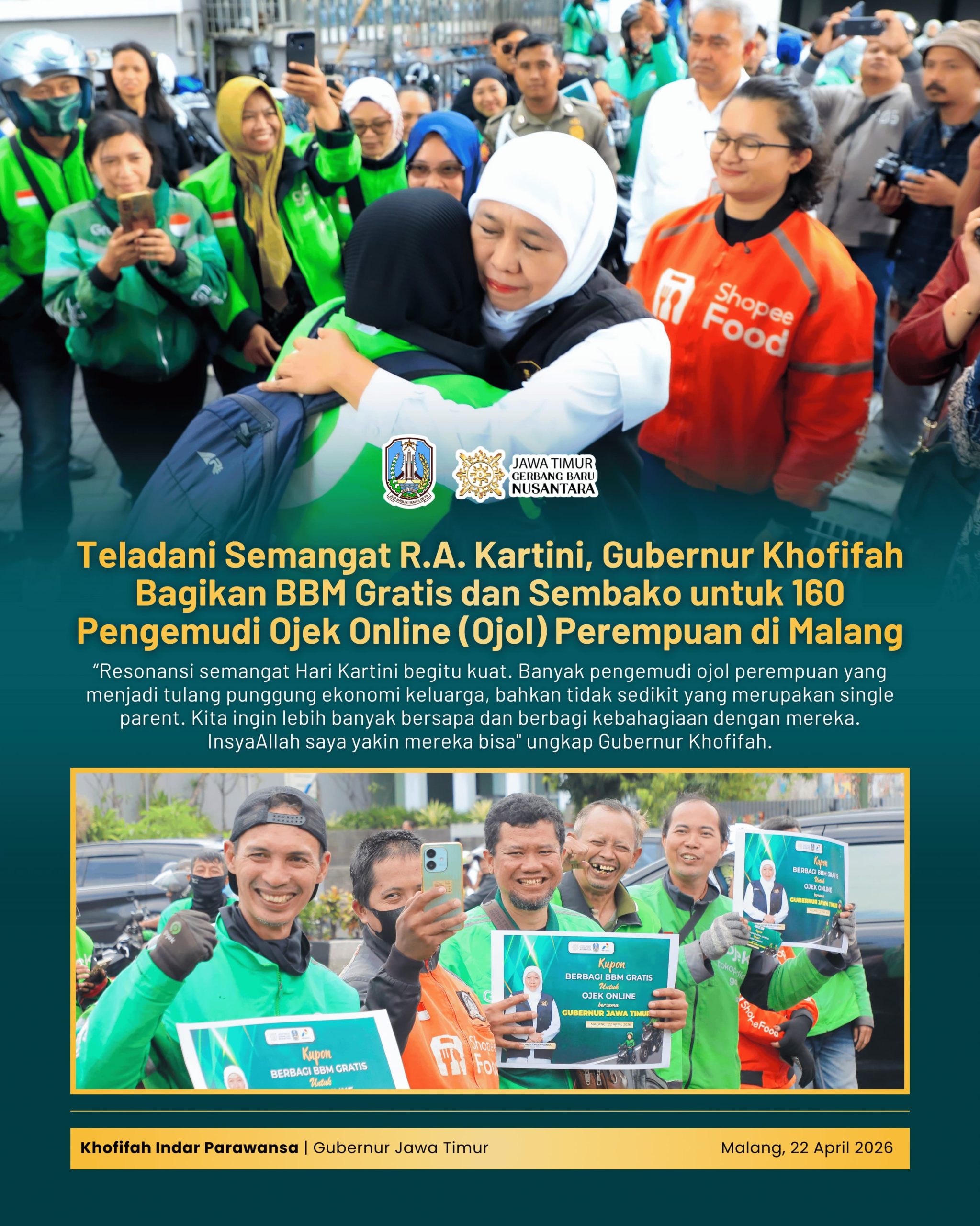 “Sebanyak 160 pengemudi dari berbagai platform seperti Gojek, Grab, Shopee, dan Maxim sangat menantikan kehadiran Ibu Gubernur. Kami merasa diperhatikan, apalagi di momentum Hari Kartini ini,” ujarnya.