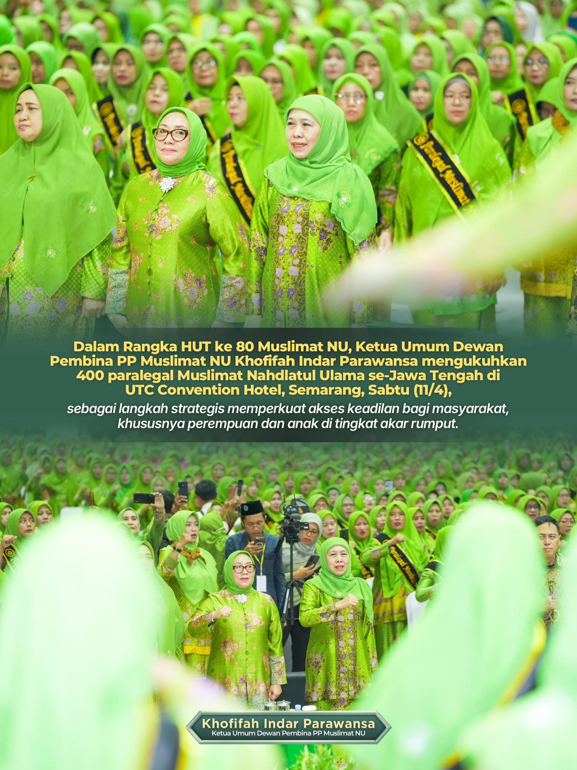 Harian Cakrawala – SEMARANG, 12 APRIL 2026, Pada HUT ke 80 Muslimat NU, Ketua Umum Dewan Pembina PP Muslimat NU Khofifah Indar Parawansa mengukuhkan 400 paralegal Muslimat Nahdlatul Ulama se-Jawa Tengah di UTC Convention Hotel, Semarang, Sabtu (11/4), sebagai langkah strategis memperkuat akses keadilan bagi masyarakat, khususnya perempuan dan anak di tingkat akar rumput.